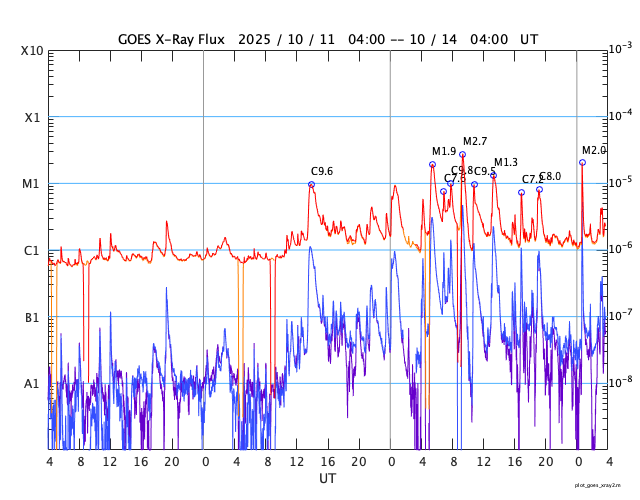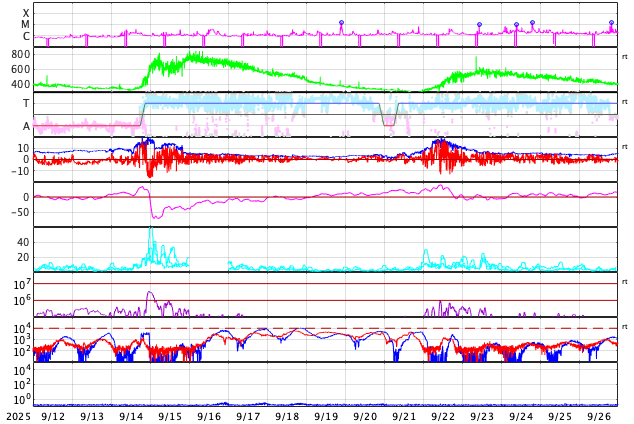 GOES衛星の太陽X線強度。赤・橙 = 0.1〜0.8 nm、青・紫 = 0.05〜0.4 nm (c) データ:NOAA/SWPC、作図:宇宙天気ニュース ![]() | |||||||||||||||||||||||||||||||||||||||||||||||||||||||||||||||||||||||||||||||||||||||||||||||||||||||||||||||||||||||||||||||||||||||||||||||||||||||||||||||||||||||||||||||||||||||||||||||||||||||||||||||||||||||||||||||||||||||||||||||||||||||||||||||||||||||||||||||||||||||||||||||