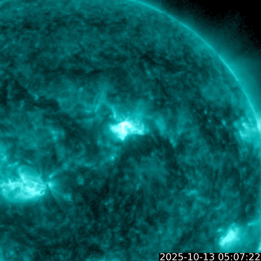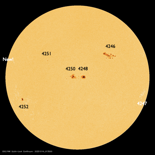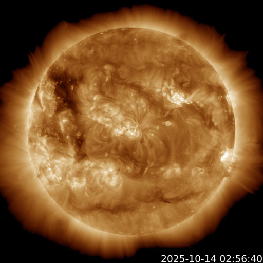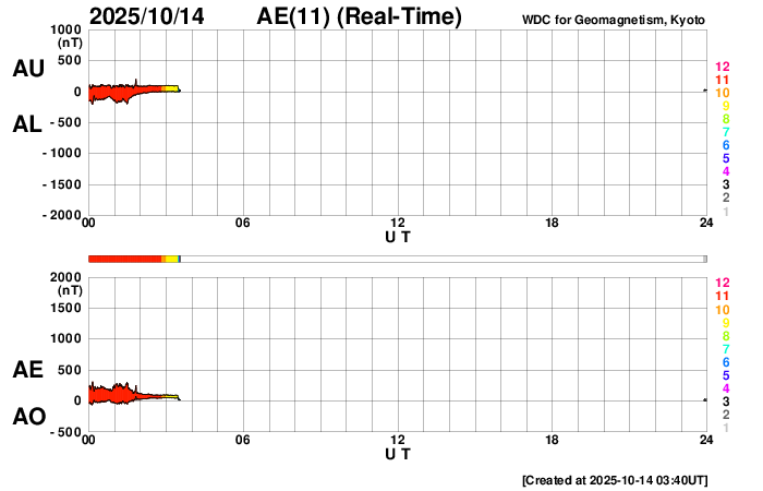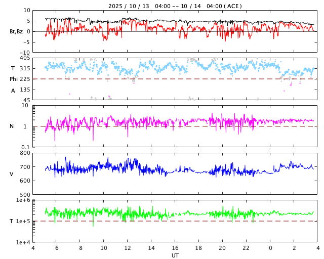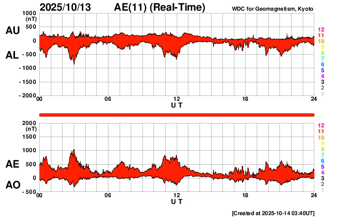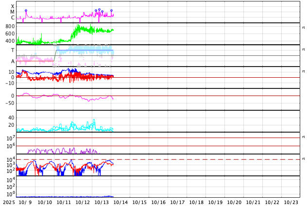 2025/10/14 12:56 更新 太陽風は700km/秒の高速風が続いています。Mクラスフレアが4回発生しています。 担当 篠原 太陽風の速度は、700km/秒から660km/秒へ少し下がりましたが、 グラフの最後で700km/秒に戻っています。 速度は、かなり高まった状態が続いています。 磁場強度は、6nTから4nTへゆっくり下がっています。 速度は高まっていますが、 高速風の領域としては後半に入ってきた様です。 GOES衛星SUVI 195では、 コロナホールは北西の端(右上)に達していて、見にくくなっています。 一方、北東(左上)のコロナホールは良く見えるようになっています。 27日前の前周期と同じ様な広がりになっています。 太陽風磁場の南北成分は、やや北寄りになっています。 速度は高まっていますが、磁気圏の活動は少し下がっていて、 AE指数は、500〜1000nTの中規模の変化が発生していますが、 発生回数が少なくなっています。 27日周期の図を見ると、 前周期の高速風は、もう2日ほど続いています。 今回はどうなるでしょうか。 太陽は、北西の4246黒点群の活動が続いていて、 M1.2、M2.7、M1.2、M2.0と中規模フレアが4回と、 Cクラスの小規模フレアが多数発生しています。 このうち、M1.9からM2.7にかけての活動の様子を、 GOES衛星SUVI 131の動画で紹介します。 4246群は、可視光写真では黒点も増えています。 活発な状況は続くでしょうか。 引き続き注目して下さい。