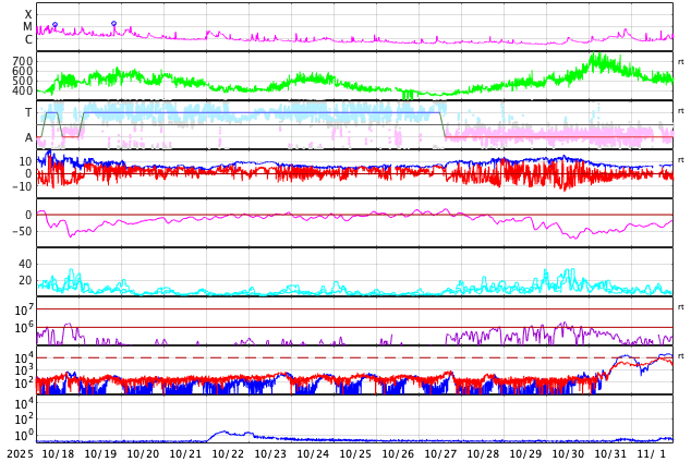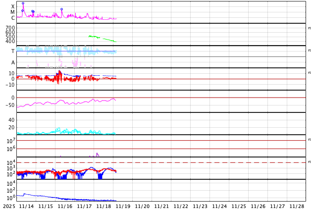 GOES衛星の太陽X線強度。赤・橙 = 0.1〜0.8 nm、青・紫 = 0.05〜0.4 nm (c) データ:NOAA/SWPC、作図:宇宙天気ニュース ![]() | |||||||||||||||||||||||||||||||||||||||||||||||||||||||||||||||||||||||||||||||||||||||||||||||||||||||||||||||||||||||||||||||||||||||||||||||||||||||||||||||||||||||||||||||||||||||||||||||||||||||||||||||||||||||||||||||||