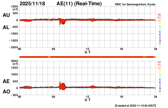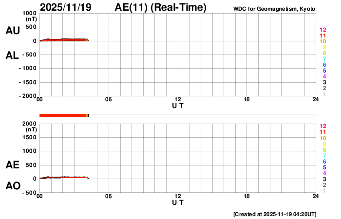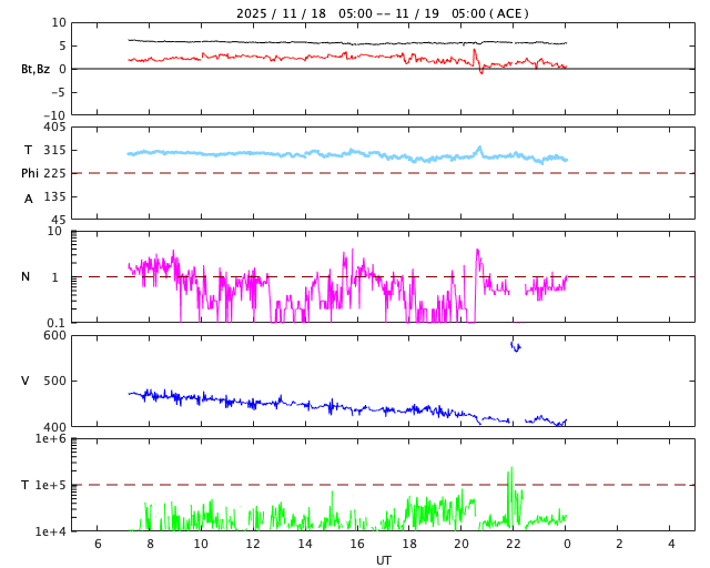 2025/11/19 13:24 更新 太陽風は平均的な速度に戻っています。磁気圏も穏やかです。 担当 篠原 太陽風の速度は、500km/秒から400km/秒へ下がり、 平均的な速さに戻っています。 磁場強度は、5nTと平均的な状態です。 磁場の南北成分は、弱い北寄りです。 磁気圏は穏やかで、AE指数はほとんど変化がありません。 GOES衛星SUVI 195では、 太陽の中心部は小さいコロナホールが見えるだけで、 太陽風はしばらく穏やかな状態が続きそうです。 太陽は、南西(右下)の4284黒点群で C1の小さいフレアが発生した程度で、穏やかです。 X線グラフは変化が見られなくなっています。 ![]() GOES衛星のSUVI 195カメラによる太陽コロナの様子 (c) NOAA/SWPC ![]() SDO衛星による太陽の可視光写真(SOHO衛星の画像ページより取得)。 マウスの矢印を写真に重ねると、黒点番号付きの写真に切り替わります。 (c) SDO (NASA) ![]() ACEが観測した太陽風の磁場(黒線は全体の強度、赤線は南北成分) 磁場の向き、プラズマの密度、速度、温度 (c) データ:NOAA/SWPC、作図:宇宙天気ニュース ![]() AE指数(速報値) 下段のAEグラフの値が高くなると、オーロラ活動が活発化しています。 (c) 京都大学WDC ![]() ![]() 27日の太陽周期に合わせた図 太陽が同じ面を地球に向けていた27日前の変化から、今後を予想することができます。 (c) 作図:宇宙天気ニュース