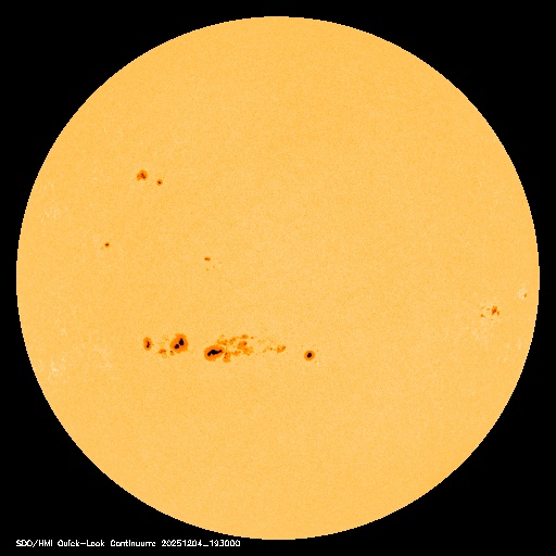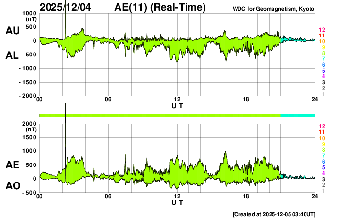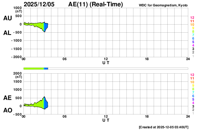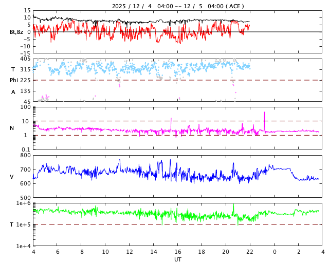 2025/12/ 5 12:53 更新 太陽風は、620km/秒と高速の状態が続いています。 担当 篠原 太陽風の速度は、昨日のニュースの後に700km/秒へ高まり、 その後は次第に低下して、現在は620km/秒です。 高速の風が続いています。 磁場強度は、7nTへ少し下がっています。 磁場の南北成分は、0nTを挟んで南北に変化しています。 磁気圏の活動は続いていて、 AE指数は、800nT前後の中規模の変化が続いています。 GOES衛星SUVI 195では、 北半球のコロナホールは、先頭が西の端(右端)に進んでいます。 この後、影響は次第に弱まりそうです。 高速の状態はどこまで続くでしょうか。 太陽は、中心部南東側(左下)の4296黒点群でC6.8、 北東(左上)の4299群でC7.3の小規模フレアが発生しています。 全体としては、穏やかに推移している印象です。 ![]() GOES衛星のSUVI 195カメラによる太陽コロナの様子 (c) NOAA/SWPC ![]() SDO衛星による太陽の可視光写真(SOHO衛星の画像ページより取得)。 マウスの矢印を写真に重ねると、黒点番号付きの写真に切り替わります。 (c) SDO (NASA) ![]() ACEが観測した太陽風の磁場(黒線は全体の強度、赤線は南北成分) 磁場の向き、プラズマの密度、速度、温度 (c) データ:NOAA/SWPC、作図:宇宙天気ニュース ![]() AE指数(速報値) 下段のAEグラフの値が高くなると、オーロラ活動が活発化しています。 (c) 京都大学WDC ![]() ![]() 27日の太陽周期に合わせた図 太陽が同じ面を地球に向けていた27日前の変化から、今後を予想することができます。 (c) 作図:宇宙天気ニュース