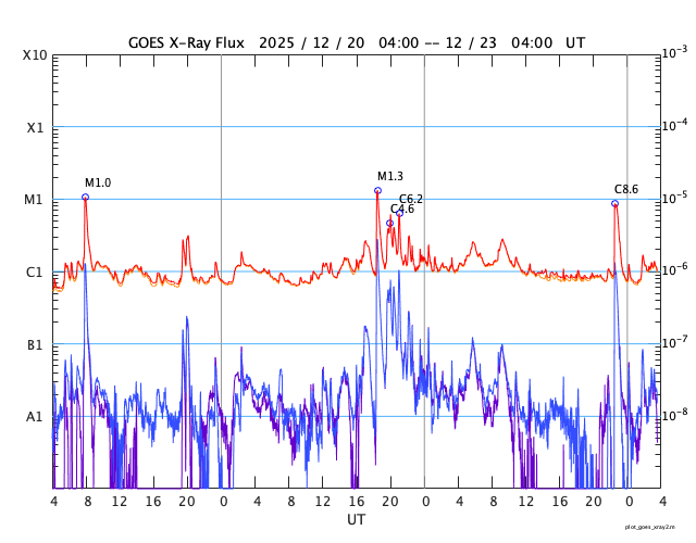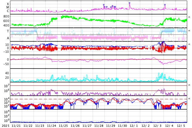 GOES衛星の太陽X線強度。赤・橙 = 0.1〜0.8 nm、青・紫 = 0.05〜0.4 nm (c) データ:NOAA/SWPC、作図:宇宙天気ニュース ![]() | ||||||||||||||||||||||||||||||||||||||||||||||||||||||||||||||||||||||||||||||||||||||||||||||||||||||||||||||||||||||||||||||||||||||||||||||||||||||||||||||||||||||||||||||||||||||||||||||||||||||||||||||||||||||||||||||||||||||||||||||||