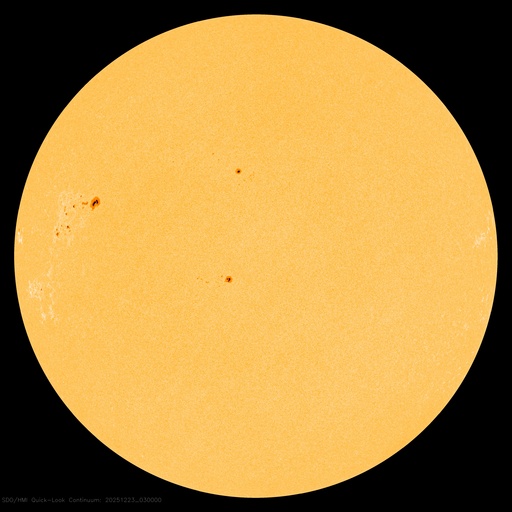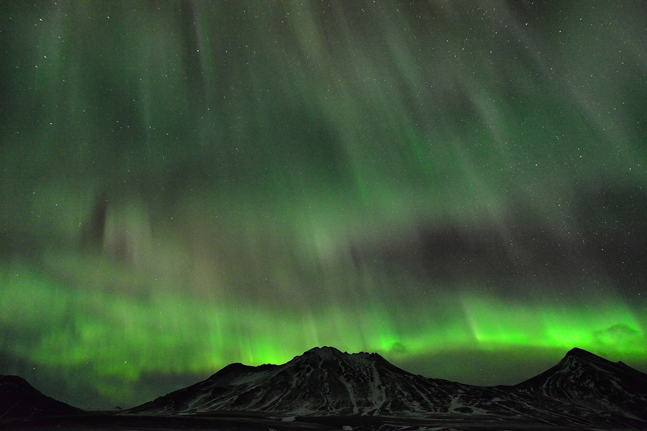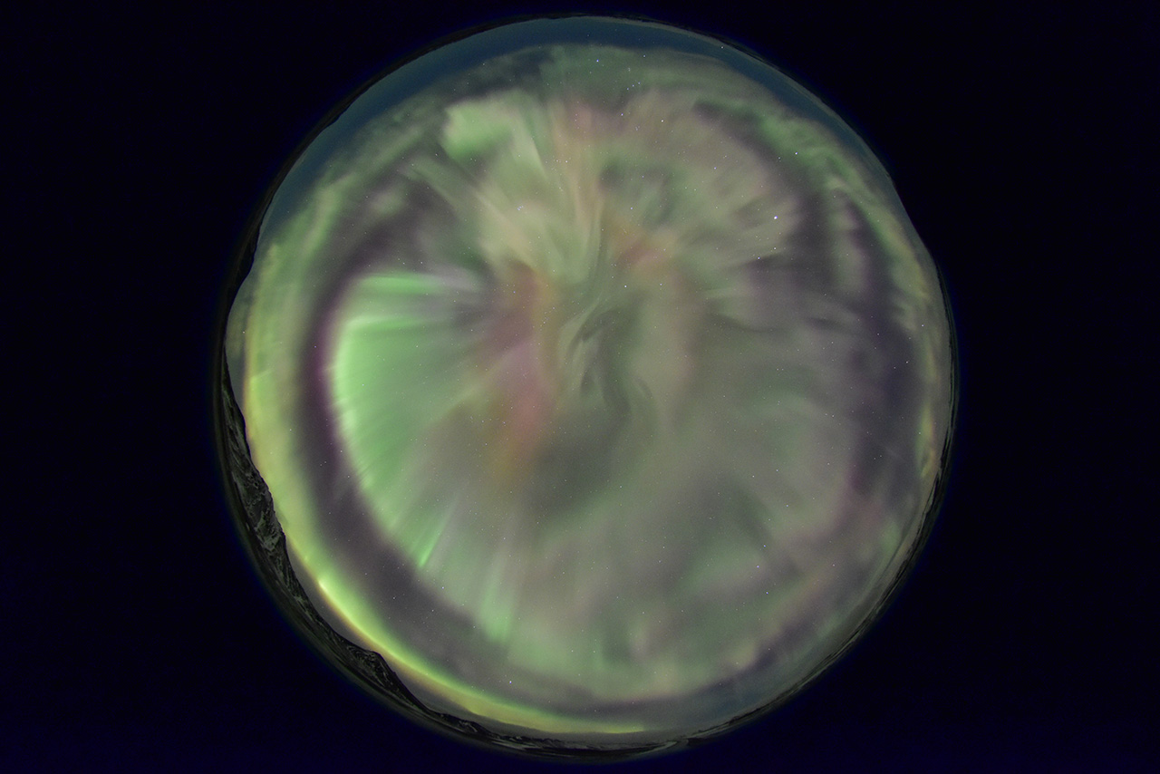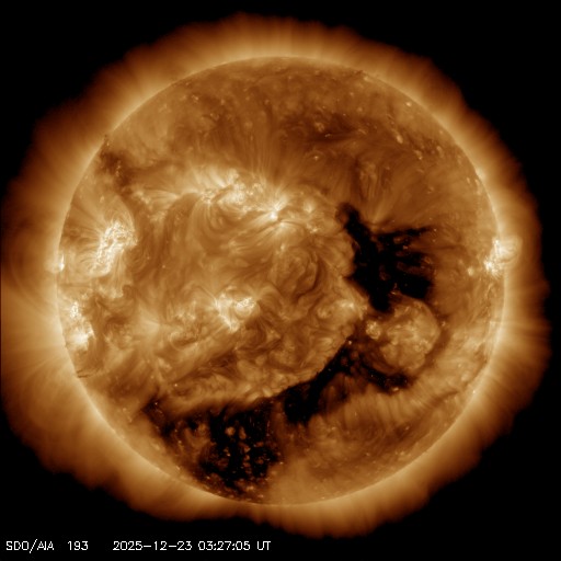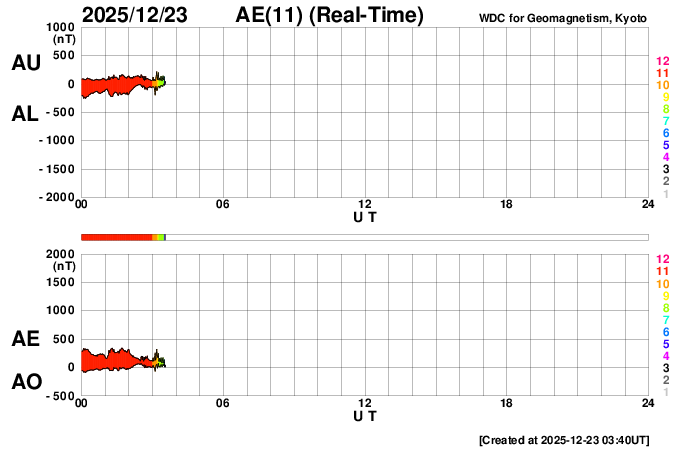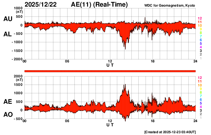 2025/12/23 12:45 更新 太陽風の速度は700km/秒に高まっています。アイスランドのオーロラをどうぞ。 担当 篠原 アイスランドに滞在中の藤井哲也さんと高家幹夫さんより、 今回の高速太陽風が始まった直後の夜、 現地21日深夜から22日にかけて撮影されたオーロラの写真をいただきました。 昨日のニュースでお知らせした様に、 太陽風の速度は世界時21日8時頃に600km/秒に高まり、 磁気圏の活動も強まって、AE指数は変化が大きくなりました。 写真は、それから半日ほど過ぎた現地21日の深夜の撮影です。 1〜3枚目の写真では、オーロラが全天を覆う様に激しく輝いています。 AE指数は、1200nTに達する大きい変化が発生しています(昨日掲載の図)。 4枚目の写真は、3枚目の左側の山とオーロラに向かっています。 1枚目は宿の駐車場でとりあえず撮影したそうで、 2枚目以降は数キロ離れた光害のない場所です。 5枚目の頃から、AE指数の変化は小さくなっています。 オーロラの光が弱くなっているのは、これと対応しているのかもしれません。 それでも、6枚目のオーロラが何重にも重なって見える様子はとても美しいです。 藤井さんによると、この夜は快晴で、気温は0度、 時々突風が吹くので、三脚の転倒対策を行うことが必要だったそうです。 太陽風の状況が変わったことで、 「今までとは違うオーロラが出現した」とのことで、 広大な原野で時間の経つのも忘れ、 いろいろな形や濃さが変化していくのに感動したそうです。 にぎやかにオーロラが輝く写真をどうもありがとうござます。 既に次の夜の写真もいただいているのですが、 今日は高速太陽風の始まりの頃のオーロラを紹介します。 太陽風は、高速の状態が続いています。 速度は680km/秒から750km/秒に高まり、 最後は700km/秒に少し下がっている様です。 磁場強度は、6〜7nTと平均的な値です。 SDO衛星AIA193では、コロナホールは西側(右側)に進み、 この領域の影響が地球にやって来ているのでしょう。 そして、コロナホールは、南東の端(左下)にかけて大きく広がっています。 次第に緯度が高くなっていますが、 27日周期の図の前周期の変化を参考にすると、 太陽風速度の高まりは、5日後の28日くらいまで続くかもしれません。 磁気圏の活動も活発で、 AE指数は、500nT前後の変化が頻繁に発生し、 1500nTに達する大きい活動も起きています。 引き続き注目して下さい。 太陽は、北東側(左上)の4317黒点群で C8.6の小規模フレアが発生しています。 目立つフレアはこれくらいですが、 可視光写真では、黒点群が増えています。
