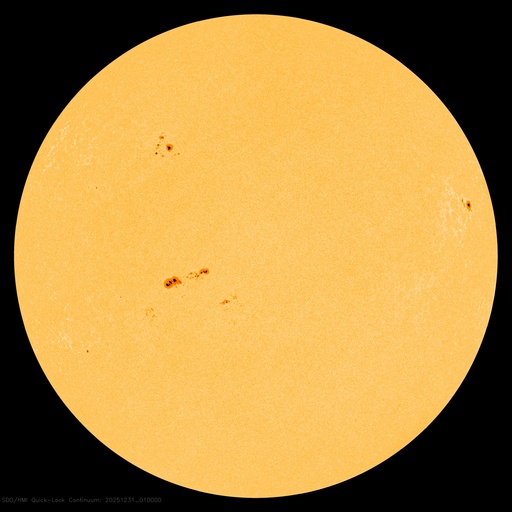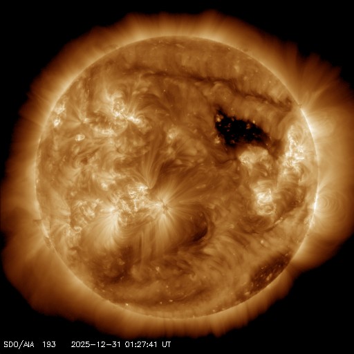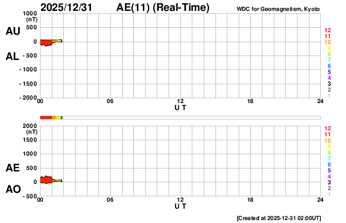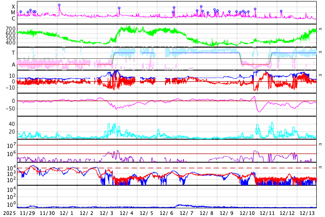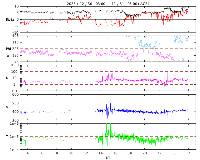 2025/12/31 11:02 更新 太陽風は400km/秒前後と平均的な速度です。 担当 篠原 太陽風の速度は、380〜420km/秒の間をゆっくり変化していて、 平均的な速度で安定しています。 磁場強度は、グラフの前半は5nTで推移していますが、 後半から少し強まり、8nT程度の変化が見られる様になっています。 磁場の南北成分は、グラフの中程でしばらく南寄りが続き、 磁気圏の活動が少し強まりました。 AE指数では、600nTの中規模の変化が発生しています。 その後は、磁場は北寄りに変わって、 AE指数は変化がなくなっています。 現在の磁気圏は穏やかです。 太陽風磁場の大まかな方向を示している2番目のグラフを見ると、 「A」から「T」に切り替わりかけています。 27日周期の図では、前周期の太陽風も この頃(12月3日)に磁場の切り替わりが発生しています。 その変化が回帰して来た様です。 前周期は、この切り替わりに続いて速度の上昇が始まっています。 今回はどうなるでしょうか。 SDO衛星AIA193では、 北半球のコロナホールは西側(右側)にだいぶ進んでいて、 影響が地球に及び始める目安の位置に達しています。 昨日のニュースで紹介したNOAA/SWPCの太陽風予報は、 その後更新されて、 世界時28日に発生したCME(コロナ質量放出)による太陽風の乱れは、 地球へはほとんどやって来ないようです。 この後の太陽風の強まりは、コロナホールのものだけになりそうです。 太陽は、北東(左上)の4324黒点群でC5.0、 南東(左下)の4325群でC4.9、C5.9(X線グラフの右端です)、 その左下の4330群(黒点は見えなくなっています)でC4.0、 などの小規模フレアが発生しています。 4325群で小さい活動が目立っています。 この後、フレアの規模はどうなるでしょうか。 これで2025年最後のニュースとなりそうです。 今年も1年間どうもありがとうございました。 引き続き、2026年もよろしくお願いします。 それでは、どうぞ良いお年をお迎えください。