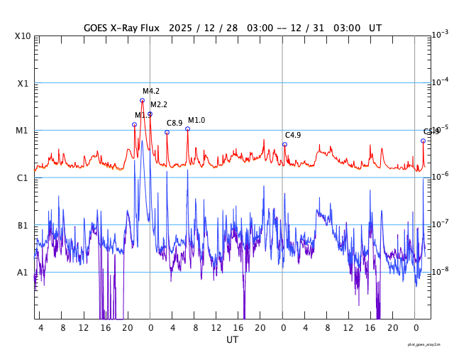 GOES衛星の太陽X線強度。赤・橙 = 0.1〜0.8 nm、青・紫 = 0.05〜0.4 nm (c) データ:NOAA/SWPC、作図:宇宙天気ニュース ![]() | ||||||||||||||||||||||||||||||||||||||||||||||||||||||||||||||||||||||||||||||||||||||||||||||||||||||||||||||||||||||||||||||||||||||||||||||||||||||||||||||||||||||||||||||||||||||||||||||||||||||||||||||||||||||||||||||||||||||||||||||||||||||||||||||||||||||||||||||||||