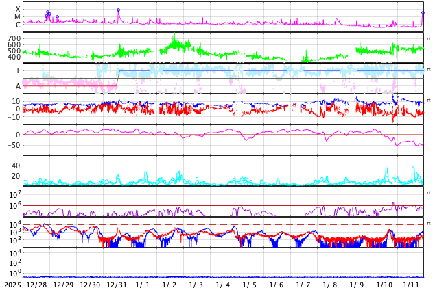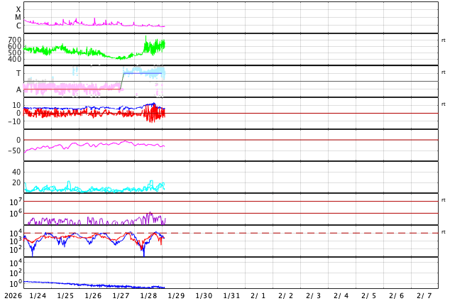 GOES衛星の太陽X線強度。赤・橙 = 0.1〜0.8 nm、青・紫 = 0.05〜0.4 nm (c) データ:NOAA/SWPC、作図:宇宙天気ニュース ![]() | ||||||||||||||||||||||||||||||||||||||||||||||||||||||||||||||||||||||||||||||||||||||||||||||||||||||||||||||||||||||||||||||||||||||||||||||||||||||||||||||||||||||||||||||||||||||||||||||||||||||||||||||||||||||||||||||||||||||||||||