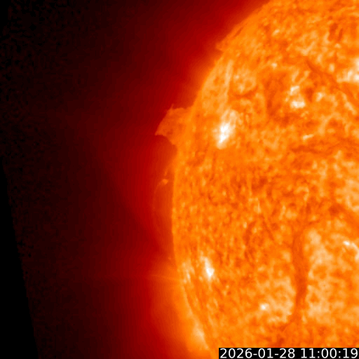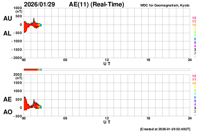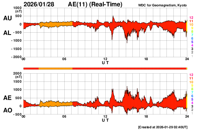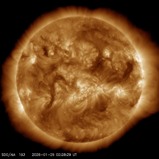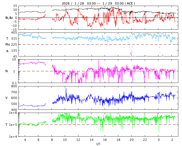 2026/ 1/29 11:45 更新 高速太陽風が到来して、速度は650km/秒に高まっています。磁気圏の活動も強まりました。 担当 篠原 太陽風の速度は、昨夕、28日18時(世界時28日9時)頃に 600km/秒へ高まり、高速の状態になりました。 グラフの最後では、650km/秒に達しています。 磁場強度は、7nTから12nTへゆっくり強まり、 グラフの後半では低下が始まって、現在は5nTと平均的な状態です。 SDO衛星AIA193で、太陽の北西側(右上)に進んでいる コロナホールの影響がやって来た様です。 前周期と比べるとコロナホールの広がりが小さくなっていたので、 影響は弱くなるかもしれないと思っていたのですが、 しっかりとした高速太陽風が到来しています。 太陽風磁場の南北成分は、南北に切り替わりながら大きく変化しています。 磁気圏の活動も強まって、 AE指数は、1000nTに達する大きい変化が次々に発生しています。 ただし、太陽風のグラフの最後では、 磁場が弱くなって南北の変化は小さくなっています。 磁気圏の活動もこの後は規模が小さくなりそうです。 太陽風速度の高まりはどのくらい続くでしょうか。 注目して下さい。 太陽は、穏やかな状態で、 X線グラフは、C1の小さい変化しか発生していません。 太陽の東端(左端)で、昨夜から今日未明にかけて、 プロミネンスの大きい変化が発生していました。 GOES衛星SUVI 304の動画を掲載します。 CME(コロナ質量放出)の噴出は特に発生していません。 ![]() 太陽の東端で見られたプロミネンスの変化。 (c) GOES衛星SUVI 304 (NOAA)、(動画加工 : 宇宙天気ニュース) ![]() SDO衛星のAIA193カメラによる太陽コロナの様子 (c) SDO (NASA) ![]() SDO衛星による太陽の可視光写真。マウスの矢印を写真に重ねると、黒点番号付きの写真に切り替わります。 (c) SDO (NASA) ![]() ACEが観測した太陽風の磁場(黒線は全体の強度、赤線は南北成分) 磁場の向き、プラズマの密度、速度、温度 (c) データ:NOAA/SWPC、作図:宇宙天気ニュース ![]() AE指数(速報値) 下段のAEグラフの値が高くなると、オーロラ活動が活発化しています。 (c) 京都大学WDC ![]() ![]() 27日の太陽周期に合わせた図 太陽が同じ面を地球に向けていた27日前の変化から、今後を予想することができます。 (c) 作図:宇宙天気ニュース