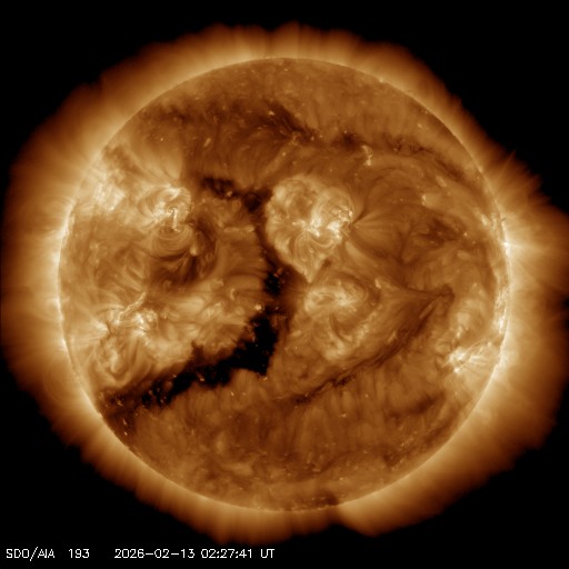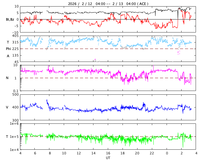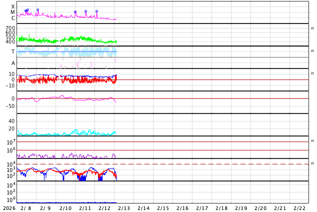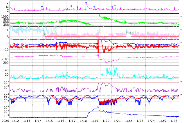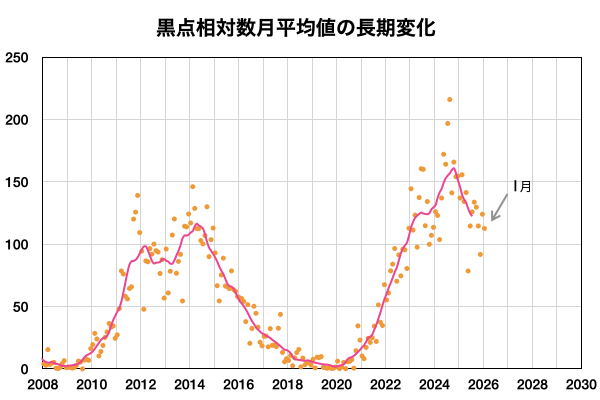 2026/ 2/13 12:33 更新 太陽風は平均的な速度が続いています。1月の黒点相対数は 112.6 でした。 担当 篠原 お知らせするのが遅くなりましたが、 WDC-SILSO より、1月の黒点相対数月平均値は、 112.6 と発表されました。 昨年の6月以降、 114.6、125.9、133.7、114.6、91.8、124.0、112.6と、 90台に下がった月もありますが、110〜130付近で推移しています。 1日値で見ると、 8〜14日は60前後に下がり、 18〜26日は150前後と黒点が多くなっています。 動画を見ると、その変化が分かります。 現在の太陽は、4366黒点群の活動が見えなくなって、 X線グラフは変化がなくなっています。 とても穏やかな状態です。 可視光写真は、黒点が少なくなっています。 太陽風は、速度は400km/秒と平均的な状態が続いています。 磁場強度は、5nTからグラフの最後で8nTと少し強まっています。 磁場の南北成分は、南向きの変化が時々発生していて、 AE指数では、600nT程度の中規模の変化が時間をおいて発生しています。 SDO衛生AIA193では、中心部に縦に伸びるコロナホールがあり、 南東の端(左下)へ斜めに伸びています。 3日後くらいから、この領域の影響で太陽風が強まるかもしれません。 南東への広がりがあるので、影響もしばらく続く可能性があります。 どの程度の変化がやってくるか注目して下さい。 ![]() 太陽黒点相対数の長期変化。1月の黒点相対数は 112.6 でした。 (c) 黒点データ:WDC-SILSO、作図:宇宙天気ニュース ![]() 1月の太陽黒点の推移。 (c) SDO衛星HMII (NASA)、(動画加工 : 宇宙天気ニュース) ![]() 1975年以降の太陽黒点相対数の長期変化。 (c) 黒点データ:WDC-SILSO、作図:宇宙天気ニュース ![]() SDO衛星のAIA193カメラによる太陽コロナの様子 (c) SDO (NASA) ![]() SDO衛星による太陽の可視光写真。マウスの矢印を写真に重ねると、黒点番号付きの写真に切り替わります。 (c) SDO (NASA) ![]() GOES衛星の太陽X線強度。赤・橙 = 0.1〜0.8 nm、青・紫 = 0.05〜0.4 nm (c) データ:NOAA/SWPC、作図:宇宙天気ニュース ![]() ACEが観測した太陽風の磁場(黒線は全体の強度、赤線は南北成分) 磁場の向き、プラズマの密度、速度、温度 (c) データ:NOAA/SWPC、作図:宇宙天気ニュース ![]() AE指数(速報値) 下段のAEグラフの値が高くなると、オーロラ活動が活発化しています。 (c) 京都大学WDC ![]() ![]() 27日の太陽周期に合わせた図 太陽が同じ面を地球に向けていた27日前の変化から、今後を予想することができます。 (c) 作図:宇宙天気ニュース