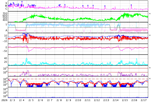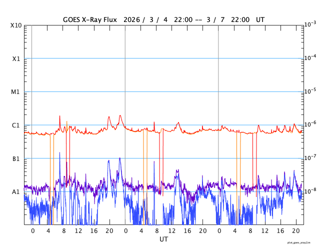 GOES衛星の太陽X線強度。赤・橙 = 0.1〜0.8 nm、青・紫 = 0.05〜0.4 nm (c) データ:NOAA/SWPC、作図:宇宙天気ニュース ![]() | ||||||||||||||||||||||||||||||||||||||||||||||||||||||||||||||||||||||||||||||||||||||||||||||||||||||||||||||||||||||||||||||||||||||||||||||||||||||||||||||||||||||||||||||||||||||||||||||||||||||||||||||||||||||||||||||