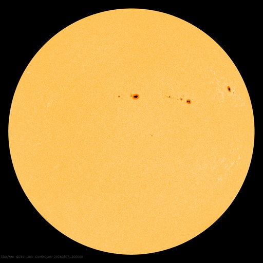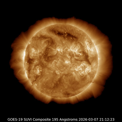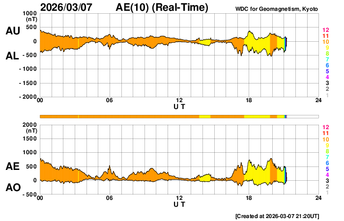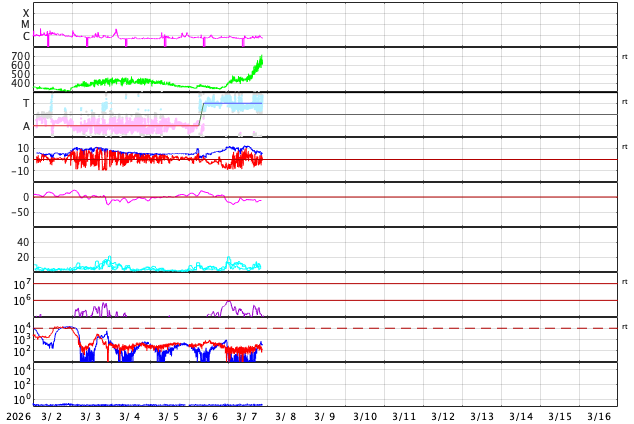 2026/ 3/ 8 06:35 更新 太陽風の速度は650km/秒に高まり、高速になっています。 担当 篠原 昨日のニュースの頃は350km/秒と低速だった太陽風の速度は、 昨日の昼頃に430km/秒と平均的な速度に上がり、 夜になると更に高まって、 今日に入る頃には500km/秒を超えて高速風に変わりました。 現在は更に上がって、650km/秒に達しています。 GOES衛星SUVI 195の太陽コロナ写真で 太陽の西側(右側)に進んでいるコロナホールの 影響がやって来たのかもしれません。 磁場強度は、10nTから5nTに下がり、 平均的な値に戻っています。 磁場の南北成分は、南北に変化が発生しています。 速度が上がった影響もあり、磁気圏の活動は高まっています。 AE指数は、後半になると750nTの中規模の変化が発生しています。 コロナホールは、太陽の北半球の高緯度域にも見えています。 この後の太陽風は、どの様に推移するでしょうか。 X線グラフに目立った変化はなく、 太陽は穏やかな状態が続いています。