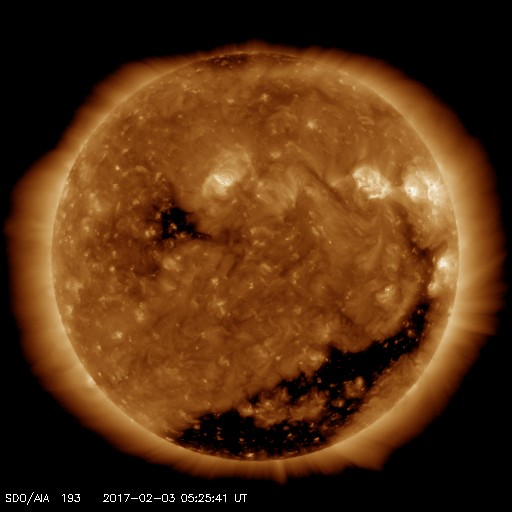 2017/ 2/ 3 14:37 更新 太陽風は、600km/秒の高速風が続いています。1月の黒点相対数は 25.8 でした。 担当 篠原 WDC-SILSOより、 1月の黒点相対数は、25.8 と発表されました。 1月は、4日から11日にかけて黒点数0の日が続き、 前半の黒点数は低調だったのですが、 後半は、ほとんどの日で30を超える状態が続き、 全体としては、前月の18.9を上回る結果となりました。 グラフ全体を見れば、 極小へ向かう減少の流れの中にあるのですが、 1月下旬からの、黒点がやや目立つ状態がどこまで続くのか、 そちらにも注目しています。 1月の無黒点の日は、8日ありました。 前半に集まっていますが、 数字としては前月よりも増えています。 現在の太陽風は、速度は少し下がったものの、 依然、600km/秒と高い速度を保っています。 磁場強度も、5nTと平均的な値が続いていて、 高速風の領域は、まだ中盤にあるようです。 太陽風磁場の南北成分は、 振れ幅は小さいですが、比較的南寄りで推移しています。 このため、磁気圏の活動も高まった状態が続き、 AE指数は、500nT前後の中規模の変化が続いています。 太陽は、昨日新しく現れた黒点に、 2633群と番号が付いています。 しかし、今日の写真では、既にかなり見にくくなっています。 放射線帯の高エネルギー電子は、 10,000を超えて、高まった状態が続いています。 前周期は、100,000には届きませんでしたが、 今回はどうなるでしょうか。 ![]() 太陽黒点相対数の長期変化。1月の黒点相対数は 25.8 でした。 (c) 黒点データ:WDC-SILSO、作図:宇宙天気ニュース ![]() 1970年以降の太陽黒点相対数の長期変化。 (c) 黒点データ:WDC-SILSO、作図:宇宙天気ニュース ![]() 1970年以降の月毎の無黒点の日数。 (c) 黒点データ:WDC-SILSO、作図:宇宙天気ニュース ![]() SDO衛星のAIA193カメラによる太陽コロナの様子 (c) SDO (NASA) ![]() SDO衛星による太陽の可視光写真。マウスの矢印を写真に重ねると、黒点番号付きの写真に切り替わります。 (c) SDO (NASA) ![]() DSCOVRが観測した太陽風の磁場(1番上の枠、黒線は全体の強度、赤線は南北成分) および、太陽風の密度(3番目の紫線)、速度(4番目の青線) (c) データ:NOAA/SWPC、作図:宇宙天気ニュース ![]() リアルタイムAE指数 下段のAEグラフの値が高くなると、オーロラ活動が活発化しています。 (c) 京都大学, NICT ![]() 27日の太陽周期に合わせたデータプロット 太陽が同じ面を地球に向けていた27日前の変化から、今後を予想することができます。 (c) 作図:宇宙天気ニュース