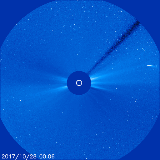2017/10/29 14:15 更新 太陽風は低速になり、磁気圏も穏やかです。彗星が去りつつあります。 担当 篠原 彗星の動画3日目は、 太陽から遠ざかっていくマックホルツ彗星です。 SOHO衛星LASCO C3の写真の右上方向に向かっています。 太陽風の速度は、今日に入る頃に400km/秒を割り、 現在は350km/秒まで下がって、低速の風に変わっています。 太陽風の磁場強度は、3〜4nTとやや弱くなっています。 南北成分は、弱い南向きに変化していますが、 磁気圏は概ね静穏で、 AE指数は、時々小さい変化が起きている程度です。 SDO衛星AIA193では、太陽の南半球のコロナホールが、 太陽の中央線に達しようとしています。 3〜4日後くらいの太陽風に、高まりが発生するかもしれません。 太陽は、X線グラフに変化はなく、 静かな状態が続いています。