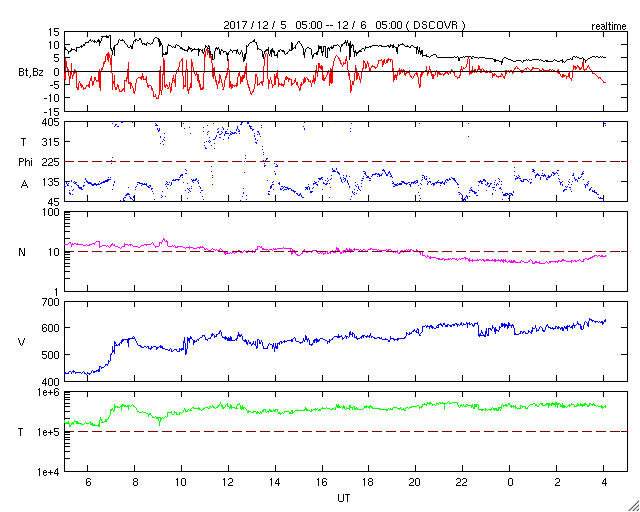 2017/12/ 6 13:14 更新 太陽の中央部に小さい黒点が発生しています。太陽風は高速風になっています。 担当 篠原 太陽の中央部に新しい黒点が出現しています。 SDO衛星の可視光写真では、 今朝、6日8時(世界時5日23時)頃から見え始めました。 できたばかりの小さい黒点ですが、 この後、どの様に推移するでしょうか。 X線グラフは変化はなく、太陽は穏やかです。 太陽風は、昨日の午後、5日16時(世界時5日7時)に 速度が500km/秒を超えて、高速の風になりました。 その後もゆっくりと速度は高まり、 今朝の段階で600km/秒に達し、そのまま安定しています。 一方、10nTを超えるくらいに強まっていた磁場強度は、 今朝以降は5nTと、平均的な値に下がっています。 磁気圏の活動も強まって、 AE指数は1000nTに達する大きな変化が半日程度続きました。 しかし、今朝以降は、磁場が弱まるとともに、 南北成分は0nT付近で小さく変化する様になっていて、 磁気圏の活動も弱まっています。 速度は高まった状態が続いていますが、 この後はどうなるでしょうか。 27日周期の図を見ると、 前周期から1日遅れくらいで高速太陽風が回帰しています。 前周期は5日ほど高速風が続きましたが、 今回は少し短くなりそうです。 ![]() SDO衛星のAIA193カメラによる太陽コロナの様子 (c) SDO (NASA) ![]() SDO衛星による太陽の可視光写真。マウスの矢印を写真に重ねると、黒点番号付きの写真に切り替わります。 (c) SDO (NASA) ![]() GOES衛星の太陽X線データ (c) NOAA/SWPC ![]() DSCOVRが観測した太陽風の磁場(1番上の枠、黒線は全体の強度、赤線は南北成分) および、太陽風の密度(3番目の紫線)、速度(4番目の青線) (c) データ:NOAA/SWPC、作図:宇宙天気ニュース ![]() AE指数(速報値) 下段のAEグラフの値が高くなると、オーロラ活動が活発化しています。 (c) 京都大学WDC ![]() ![]() 27日の太陽周期に合わせたデータプロット 太陽が同じ面を地球に向けていた27日前の変化から、今後を予想することができます。 (c) 作図:宇宙天気ニュース