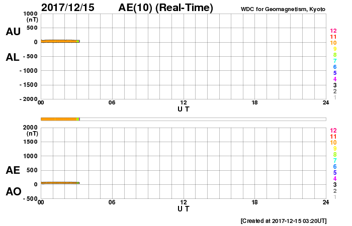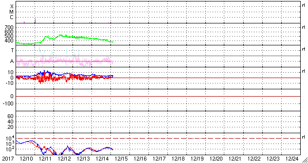 2017/12/15 12:31 更新 太陽風は低速風に変わりかけています。太陽の東端に黒点が現れるかもしれません。 担当 篠原 太陽風の速度は、今朝早くに400km/秒台を割り、 370km/秒まで下がっています。 太陽風は次第に低速の風に変わっています。 磁場強度も、4nTへ少し下がっています。 磁気圏は静穏で、AE指数は特に変化は起きていません。 27日周期の図を見ると、 前周期の11月19〜20日は低速風になっていて、 今回も同様の推移になっている様です。 前回は11月21日に速度の上昇が発生していますが、 現在もSDO衛星AIA193の太陽コロナ写真では、 太陽の中央部のコロナホールが西に進んでいて、 今後、この領域の影響が到来しそうです。 どのタイミングで変化が始まるか、注目してください。 太陽は、無黒点の状態が続いています。 SDO衛星やSTEREO Ahead衛星によると、 太陽の東端の向こう側に活動的な領域がある様です。 (掲載のSDO衛星AIA193の左端の明るい部分です) 今後こちら側に回ってきますが、黒点はあるでしょうか。 ![]() SDO衛星のAIA193カメラによる太陽コロナの様子 (c) SDO (NASA) ![]() SDO衛星による太陽の可視光写真 (c) SDO (NASA) ![]() DSCOVRが観測した太陽風の磁場(1番上の枠、黒線は全体の強度、赤線は南北成分) および、太陽風の密度(3番目の紫線)、速度(4番目の青線) (c) データ:NOAA/SWPC、作図:宇宙天気ニュース ![]() AE指数(速報値) 下段のAEグラフの値が高くなると、オーロラ活動が活発化しています。 (c) 京都大学WDC ![]() ![]() 27日の太陽周期に合わせたデータプロット 太陽が同じ面を地球に向けていた27日前の変化から、今後を予想することができます。 (c) 作図:宇宙天気ニュース