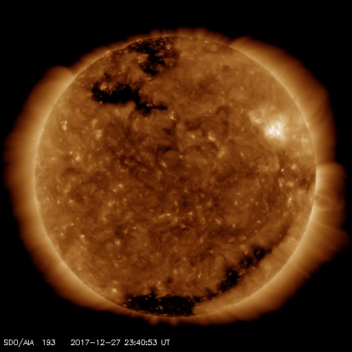 2017/12/28 08:53 更新 太陽風は平均的な速度です。太陽は無黒点になっています。 担当 篠原 昨日のニュースの後、 太陽風の速度は再び450km/秒に少し上がりましたが、 今朝に入ってまた下がり、 現在は400km/秒と平均的な状態に戻っています。 一方、磁場強度は5〜10nTとやや強まった状態が続いています。 SDO衛星AIA193の太陽コロナ写真を見ると、 南半球のコロナホールは、太陽の西の端に近付いています。 影響はこの程度で終わるのか、もうしばらく残るのか、 この後の変化にも注目して下さい。 磁気圏では、ある程度の活動が続き、 AE指数は500nTの変化が時々発生しています。 太陽風がこのまま穏やかになれば、 磁気圏も静かになっていくでしょう。 太陽は、2692黒点群が見えなくなり、 無黒点になっています。 X線グラフも変化はありません。