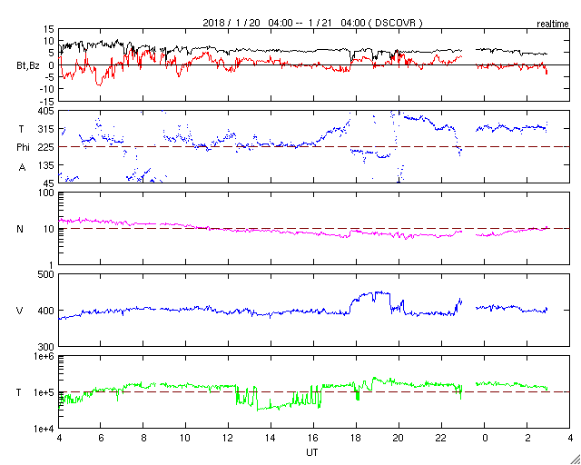 2018/ 1/21 12:14 更新 太陽風は平均的な状態が続き、高まりは来ていません。 担当 篠原 太陽風の速度は、高まることなく、 400km/秒と平均的な状態を保っています。 やや強まっていた磁場強度は、 今日にかけて次第に下がり、 現在は5nTとこちらも平均的な値です。 27日周期の図を参照すると、 前周期の太陽風の高まり(12月24日)から、 既に1日近く遅れています。 一方、SDO衛星AIA193の太陽コロナ写真では、 コロナホールの先頭(右端)は、太陽の西の端に近づいていて、 高速風の始まりの目安の位置は過ぎています。 コロナホールは南半球にかけて細長く伸びているため、 どこかのタイミングで 地球にも太陽風の乱れはやって来るのではないかと思います。 この後どのように推移するのか、注目してください。 磁気圏では、小規模の活動がある程度続いていて、 AE指数のグラフは、 250nT程度の小さい変化が頻繁に起きています。 太陽は無黒点です。 2696黒点群のあった領域で小さい活動が見えている程度です。