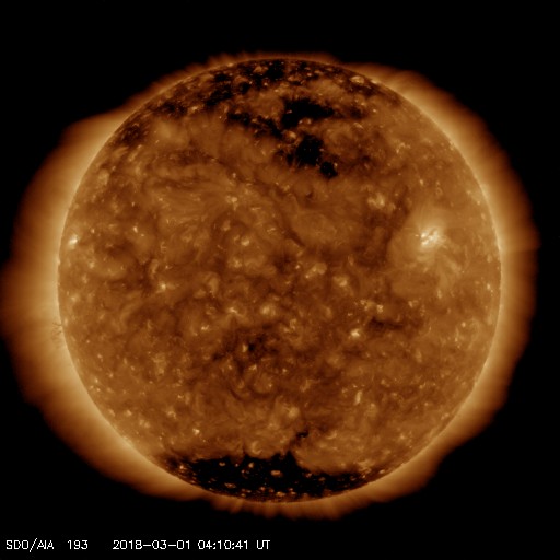 2018/ 2/28 13:13 太陽風の速度は500km/秒台に高まりました。2700黒点群は小さくなっています。