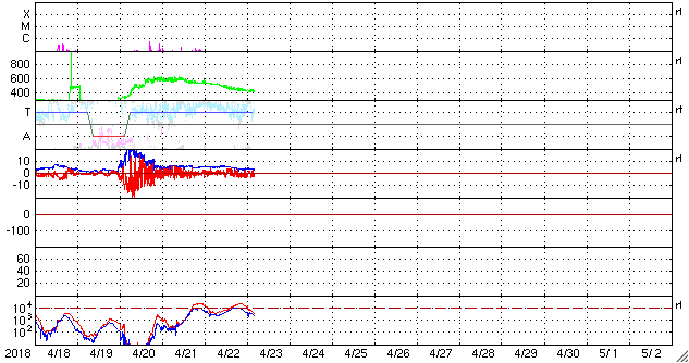 2018/ 4/23 13:27 更新 太陽風は平均的な速度に戻っています。 担当 篠原 太陽風の速度は、昨日の夜には500km/秒台を割り、 以降もゆっくりと低下して、 現在は430km/秒と平均的な速さに戻っています。 今回の高速太陽風は、2日半程で終わっています。 太陽風の磁場強度も、5nTから3nTへ下がり、 やや弱くなっています。 磁気圏の活動は、 昨日までと比べると穏やかになっていますが、 磁場の南北成分が南向きに小さく変化しているため、 AE指数で300〜500nTの弱い活動は続いています。 太陽では、2706黒点群が昨日と同程度の大きさで見えています。 X線グラフでは特に変化はなく、活動は穏やかです。 一方、SDO衛星AIA193の画像では、 黒点から磁力線に沿って広がるコロナの姿が見事です。 この1日間の様子を動画で紹介します。