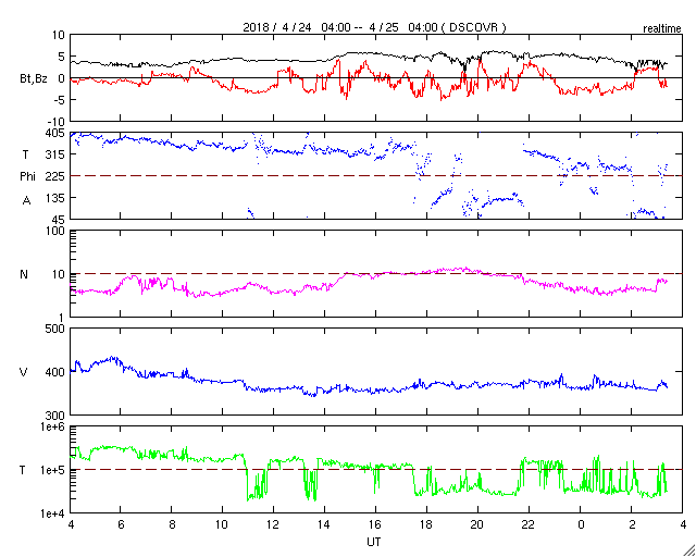 2018/ 4/22 13:07 高速太陽風は続いていますが、速度は下がり始めています。