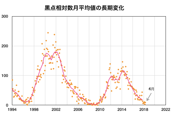 2018/ 5/ 3 12:51 更新 太陽風は低速になっています。4月の黒点相対数は 8.9 でした。 担当 篠原 WDC-SILSOより、黒点相対数の新しいデータが発表され、 4月の月平均値は、8.9 でした。 3月の 2.5 よりは高くなっていますが、 昨年の11月以降は、 10 を割るくらいの低い状態が続いています。 無黒点日の日数は13日と、 3月の25日から大きく下がりました。 4月中旬に2704黒点群が発生し、 後半には2706黒点群がやや大きくなっていたためです。 しかし、4月28日以降は再び無黒点の状態が続いています。 5月はどのような推移になるでしょうか。 現在の太陽風は、速度が360km/秒に下がり、 低速の風になっています。 磁場強度は、5nTと平均的な状態です。 磁場の南北成分は、北寄りの傾向が続いています。 磁気圏も穏やかで、 AE指数のグラフはほとんど変化が見られません。 SDO衛星AIA193では、 コロナホールの先頭(右端)が、太陽の中心に達しています。 3日後くらいから、太陽風の高まりが始まりそうです。 太陽は今日も無黒点です。 X線グラフも変化はなく、太陽はとても穏やかです。