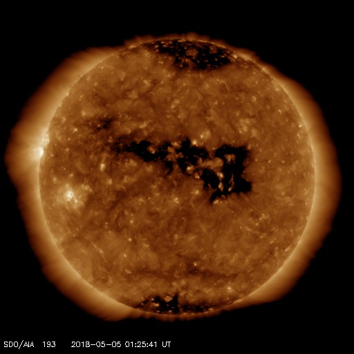 2018/ 5/ 5 10:41 更新 太陽風は低速です。今後、コロナホールの影響が始まりそうです。 担当 篠原 太陽の東側の赤道近くに新しい黒点が現れ、 2708群と番号が付けられています。 X線グラフに変化はなく、 2708群は特に活動は起こしていません。 一方、太陽の東端から活動的な領域が近付いています。 ちょうど見え始めたくらいで、黒点の有無はまだ分かりません。 注目してください。 太陽風は、速度が350km/秒から330km/秒へ下がり、 更に低速になっています。 磁場強度も3〜4nTを推移していて、やや弱い状態です。 磁気圏は静穏で、AE指数は特に変化は起きていません。 太陽風磁場の南北成分を見ると、 グラフの後半から南寄りの傾向になっています。 27日周期の図を見ると、 太陽風磁場の大まかな方向が、 「A」から「T」に切り替わっていて、 この変化の影響かもしれません。 今後も磁場の南寄りの傾向が続くと、 磁気圏の活動は高まりやすくなります。 明日くらいからコロナホールの影響が始まりそうです。 オーロラの活動の変化にも注目してください。 ![]() SDO衛星のAIA193カメラによる太陽コロナの様子 (c) SDO (NASA) ![]() SDO衛星による太陽の可視光写真。マウスの矢印を写真に重ねると、黒点番号付きの写真に切り替わります。 (c) SDO (NASA) ![]() GOES衛星の太陽X線データ (c) NOAA/SWPC ![]() DSCOVRが観測した太陽風の磁場(1番上の枠、黒線は全体の強度、赤線は南北成分) および、太陽風の密度(3番目の紫線)、速度(4番目の青線) (c) データ:NOAA/SWPC、作図:宇宙天気ニュース ![]() AE指数(速報値) 下段のAEグラフの値が高くなると、オーロラ活動が活発化しています。 (c) 京都大学WDC ![]() ![]() 27日の太陽周期に合わせたデータプロット 太陽が同じ面を地球に向けていた27日前の変化から、今後を予想することができます。 (c) 作図:宇宙天気ニュース
