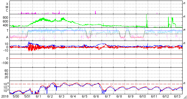 2018/ 7/ 1 13:00 更新 太陽風は平均的な速さに戻りつつあります。磁気圏も穏やかです 担当 篠原 太陽風は、420km/秒と平均的な速さまで下がったところで安定し、 今朝早く一時的に480km/秒まで上がる変化も起きましたが、 すぐに下がって、現在は再び420km/秒へ戻っています。 まだ、完全に落ち着いてはいませんが、 高速太陽風は終わろうとしています。 太陽風の磁場強度は、5nTから3nTヘ下がり、 やや弱くなっています。 南北成分は、グラフの前半は小さく南北に変化していますが、 後半は0nT付近に留まっています。 磁気圏は概ね静穏で、 AE指数は、小さい高まりが数回起きている程度です。 SDO衛星AIA193では、 太陽の中央部から東側(左型)にかけては、 全体がぼんやりと見えていて、コロナホールは見られません。 現在の太陽風が落ち着いた後は、 穏やかな状態がしばらく続きそうです。 太陽は、黒点は見られず、 X線グラフも変化のない状態です。