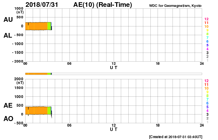 2018/ 7/31 12:51 更新 太陽風磁場がやや強まりました。低速風は続いています。 担当 篠原 昨夜遅くから今朝にかけて、 太陽風の磁場強度が、10nT近くに強まる変化が発生しています。 現在は、5nTに戻っています。 一方、太陽風の速度は、 300km/秒から330km/秒に少し高まる変化が見られた程度で、 低速の状態が続いています。 太陽風磁場の南北成分は、 強度が高まったことで、南北にもやや大きく振れて、 -5nT程度の南向きの変化も発生しています。 速度が下がっているため、大きな変化にはなっていませんが、 AE指数のグラフでは、31日5時半(世界時30日20時半)頃に、 変化の高まりが見えています。 南極の昭和基地でも、オーロラの高まりが見えていました。 全天カメラによる動画を掲載します。 27日周期の図を見ると、 前周期も7月3日に磁場強度の高まりが始まっています。 この時は、2日ほど経った頃に速度の高まりが始まったのですが、 今回はどうなるでしょうか。 太陽は、東端の活動的な領域は、 掲載の可視光写真では白斑が見えるだけです。 X線グラフも変化はなく、穏やかな状態が続いています。