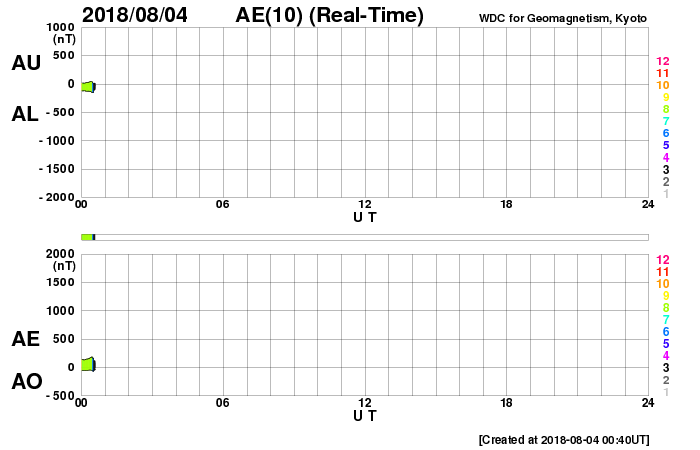 2018/ 8/ 4 09:57 更新 太陽風は平均的な状態です。太陽は無黒点です。 担当 篠原 太陽風は、速度は380〜400km/秒、 磁場強度は4〜5nTと、平均的な状態で推移しています。 前周期の速度の高まりは、無くなっている様です。 磁場の南北成分は、振れ幅は小さいですが、 南北にゆっくりと変化しています。 磁気圏は全体としては穏やかですが、 磁場が南向きに振れた頃に、 AE指数が1000nTに達する中規模の活動も起きています。 (AE指数のグラフが見やすくなっています) SDO衛星AIA193の太陽の中央部北側に、 小さいコロナホールが見えています。 規模は小さいですが、27日前には見えていなかった領域です。 2〜3日後の太陽風に変化が見られるでしょうか。 太陽は、無黒点の状態です。 SDO衛星AIA193を見ると、 太陽の東端から明るい領域が現れてきましたが、 黒点の有無はまだ分かりません。 現時点では、特に活動的な様子も見られません。