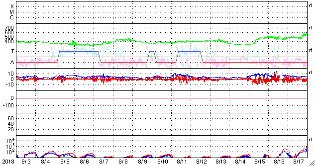 2018/ 9/ 4 13:11 更新 低速の太陽風が続いています。イエローナイフのオーロラをどうぞ。 担当 篠原 高坂雄一さんより、昨日につづいて、 カナダ・イエローナイフで撮影されたオーロラの写真をいただきました。 撮影は、現地3日1時半(世界時3日7時半)頃です。 この夜は夕食後から厚い雲に覆われてしまったそうですが、 雲の切れ間を探して走り回って、 この時間から30分間だけ北の空が見えて、 オーロラを撮影できたそうです。 太陽風は低速の状態が続き、磁場強度も弱く、 厳しい条件は続いていましたが、 少し前から磁場の南北成分が -2〜 -3nTと 弱いながらも南向きに振れていました。 ちょうど良いタイミングで空に晴れ間が見えて、 オーロラの観測に成功したのかもしれません。 1枚目と3枚目の写真の中央には、北斗七星が見えています。 日本からと違い、地平線からずっと離れた空を下方通過しています。 2枚目の写真の中央は北極星です。 こちらでは、上にカシオペヤ、下に北斗七星が写っています。 走り回った成果と言える貴重なオーロラ写真を、 ありがとうございます。 太陽風は、330km/秒から350km/秒に少し速度が上がっていますが、 低速の状態が続いています。 磁場強度は、2〜3nTと弱い状態が続いていましたが、 グラフの最後で5nTを超えるくらいにやや上がっています。 磁場の南北成分は、南を向いたり、北を向いたりしています。 前半は振れ幅は小さかったのですが、 グラフの最後は、 強度が上がったため南北成分の振れ幅もやや大きくなっています。 速度は低速ですが、磁気圏の活動をやや高めているかもしれません。 今日もAE指数のページが停止しているため、 磁気圏の状況を詳しく見ることはできません。 SDO衛星AIA193では、 太陽の中心部のやや南寄りにコロナホールが見えています。 ちょうど今、地球の方向に速度の高い太陽風が流れ出していて、 3日後くらいに地球に到来する可能性があります。 どの程度の変化がやって来るでしょうか。 太陽は無黒点が続いています。 X線グラフも変化はありません。 放射線帯の高エネルギー電子は、 GOES15(赤線)だけが1万に達しましたが、 その後大きく減少する変化が起きています。 明日は両衛星とも1万を割っていそうです。