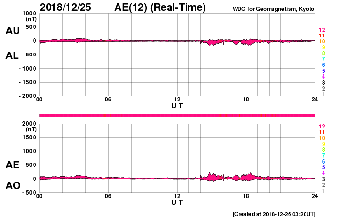 2018/12/26 12:38 更新 低速の太陽風が続き、磁気圏も概ね静穏です。 担当 篠原 太陽風の速度は、 320km/秒から360km/秒へ少し上がっていますが、 低速の状態が続いています。 磁場強度は、5nTから4nTへ少し下がっています。 磁気圏も基本的に穏やかで、 AE指数のグラフは、太陽風磁場が南寄りになった時間帯に 200nTの小さい変化が起きている程度です。 SDO衛星AIA193では、 コロナホールは太陽の西側に進んでいます。 2日後くらいに影響が始まりそうですが、 27日周期の図を見ると、 前周期の太陽風(12月1日以降の変化)は、 速度が450km/秒に高まった程度です。 コロナホールが小さくなっていることを考えると、 影響は更に弱くなるかもしれません。 太陽は無黒点で、穏やかな状態が続いています。 ![]() SDO衛星のAIA193カメラによる太陽コロナの様子 (c) SDO (NASA) ![]() SDO衛星による太陽の可視光写真 (c) SDO (NASA) ![]() DSCOVRが観測した太陽風の磁場(1番上の枠、黒線は全体の強度、赤線は南北成分) および、太陽風の密度(3番目の紫線)、速度(4番目の青線) (c) データ:NOAA/SWPC、作図:宇宙天気ニュース ![]() AE指数(速報値) 下段のAEグラフの値が高くなると、オーロラ活動が活発化しています。 (c) 京都大学WDC ![]() ![]() 27日の太陽周期に合わせたデータプロット 太陽が同じ面を地球に向けていた27日前の変化から、今後を予想することができます。 (c) 作図:宇宙天気ニュース