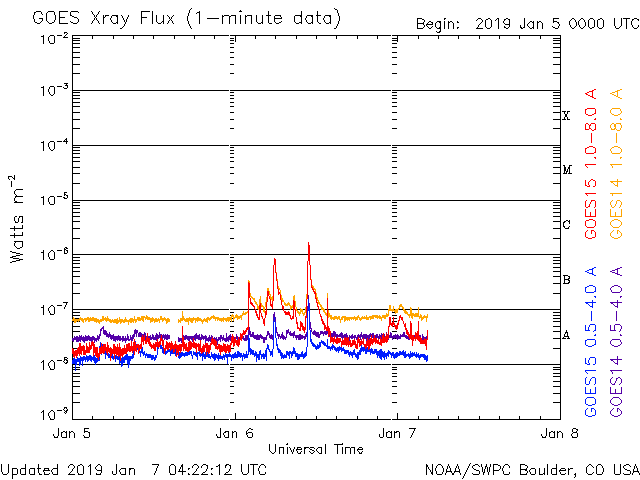 2019/ 1/ 7 13:27 更新 半年ぶりにCクラスの小規模フレアが発生しました。高速の太陽風が続いています。 担当 篠原 昨夜、6日19時半(世界時6日10時半)に、 太陽の西の端近くの2732黒点群で、 C1.6の小規模フレアが発生しました。 SDO衛星AIA131による動画を掲載します。 Cクラスに達するフレアの発生は、 2018年7月6日(世界時)に発生した同じC1.6のフレア以来で、 半年ぶりのことです。 2732群は昨日の昼頃から活動がやや活発になって、 B3.1やB8.6の小さいフレアを起こす様になり、 その後、C1.6のフレアが発生しました。 2732群は太陽の端に没して、既に見えなくなっています。 この後の変化を確認できないのは残念です。 現在の太陽は無黒点です。 太陽風は、速度が500km/秒から530km/秒へ 更に高まっています。 最高速度のタイミングも前周期より遅れて到来した様です。 太陽風の磁場強度は5nTから3nTへ下がり、 やや弱くなっています。 高速太陽風は次第に弱まっていきそうです。 太陽風磁場の南北成分は、南向きの変化も発生していますが、 全体としては、0nT付近かやや北寄りになっています。 磁気圏の活動も、全体としては昨日より小さくなっていて、 磁場が南向きになった頃に、 AE指数800nTの中規模の変化が発生した程度です。