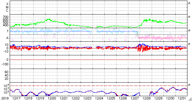 2019/ 1/18 10:48 更新 太陽風の速度がやや高速になっています。 担当 篠原 太陽風の速度が高まっています。 昨夜、17日20時(世界時17日11時)頃までは、 400km/秒付近で安定していたのですが、 その後、急に470km/秒へ高まる変化が到来し、 現在まで、470〜500km/秒とやや高速の状態になっています。 太陽風の磁場強度は、 5nTから10nTへ高まり、 再び5nTに戻る変化になっています。 磁場の強まりは一段落しているので、 速度の高まりもこのくらいで留まるのでしょうか。 27日周期の図を見ると、 前周期の速度の高まりからは、 だいぶ遅れて変化が発生しました。 今後の推移はどうなるでしょうか。 注目してください。 太陽風磁場の南北成分は、 グラフの前半は北寄りですが、 速度が高まった頃から、南北に変化する様になっています。 磁気圏では小規模の活動が起きていて、 AE指数は、300〜500nTの変化が発生しています。 太陽は、無黒点で穏やかです。