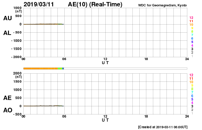 2019/ 3/12 14:10 更新 太陽風は低速で、磁気圏も穏やかです。 担当 篠原 太陽風の速度は、340km/秒と低速の状態が続き、 グラフの最後で370km/秒に少し上がった程度です。 磁場強度は、5nTから7nTヘ少し強まっています。 磁場の南北成分は、0nT付近で小さく変化しています。 磁気圏は穏やかな状態が続き、 AE指数は300nTの小さい変化が1度起きている程度です。 27日周期の図では、 前周期の太陽風はこの後500km/秒へゆっくりと上昇しています。 今回はどの様に推移するでしょうか。 昨日紹介した縦に伸びるコロナホールは、 まだ、太陽の中心線を通り過ぎた程度です。 太陽は穏やかで、 2734黒点群は小さくなり、西の端に近付いています。
