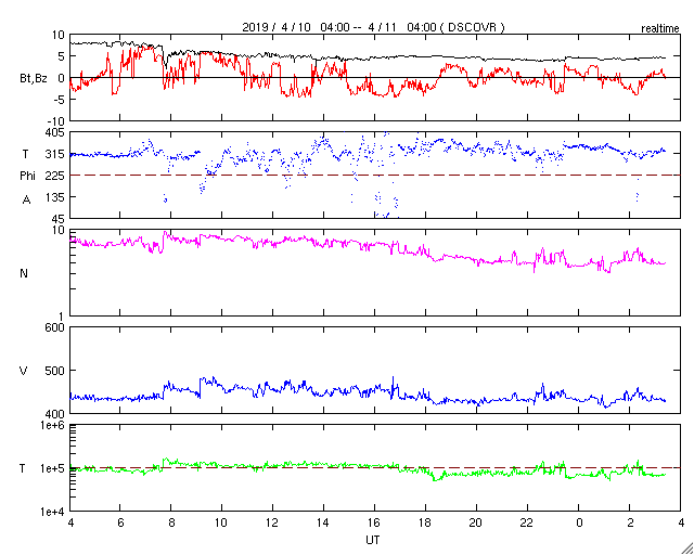 2019/ 4/11 12:39 更新 太陽風は400km/秒台で安定しています。2738黒点群は大きな姿を保っています。 担当 篠原 太陽風の速度は、 430km/秒から470km/秒に少し上がって、 再び430km/秒に戻るという小幅の変化をしています。 磁場強度は、8nTから5nTに下がって、 平均的な状態です。 磁場の南北成分は、 0nTを挟んで、南北両方に変化しています。 振れ幅は次第に小さくなっていて、 AE指数では500nT前後の変化が発生していますが、 変化は次第に小さくなっている様です。 太陽風は安定した状態が続いています。 SDO衛星AIA193の太陽写真にはコロナホールはなく、 太陽風はこの後も穏やかに推移しそうです。 太陽は、2738黒点群が大きな姿を保っています。 X線グラフは、Bクラスの小さい変化が時々発生していて、 活動度に変化は見られません。 この後どの様に推移するのか、引き続き注目してください。