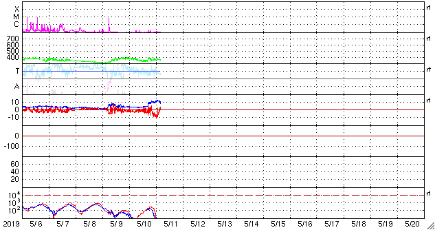 2019/ 5/11 13:23 更新 太陽風の弱い乱れが到来しました。磁気圏の活動も少し高まっています。 担当 篠原 5月6日のCMEによると思われる太陽風の小規模の乱れが、 深夜、11日2時(世界時10日17時)にやって来ました。 太陽風の磁場強度が5nTから10nT近くに高まり、 プラズマの密度は、1cm^3あたり6個から15個ほどに増加し、 速度も、330km/秒から370km/秒へ少しだけ高まりました。 磁場の南北成分は、初めは0nT近くだったのですが、 その後、-10nTと南向きに強まり、 磁気圏では、AE指数が1000nTに達するオーロラの活動が発生しています。 現在は、磁場強度は強まったままですが、 南北成分は0nTに戻っています。 磁気圏の活動の高まりはここまでで終わりそうです。 太陽では、X線グラフには目立った変化はありませんが、 2734黒点群付近で小さい爆発現象が起きています。 STEREO Ahead衛星によると、この爆発に伴って、 弱いCMEの噴出も起きている様です。 4日後くらいに、弱い太陽風の乱れがやって来るかもしれません。 可視光写真では、右の2740黒点群が少し小さくなっている様です。