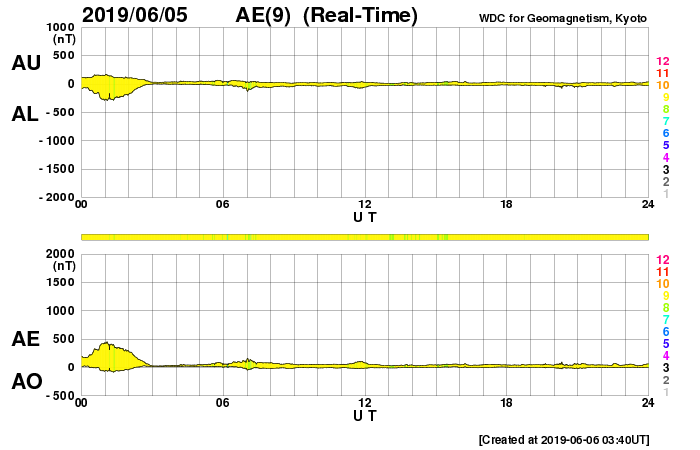 2019/ 6/ 6 12:43 更新 低速の太陽風が続いています。5月の黒点数は 10.1 でした。 担当 篠原 WDC-SILSOより、 5月の黒点相対数の月平均値は、 10.1 と発表されました。 かろうじてですが、2桁になったのは、 昨年、20018年6月の15.6以来で、およそ1年ぶりです。 その原因となったのは、 ちょうど1周期前の5月上旬に現れていた 2740、2741の2つの黒点群です。 5月4日から18日まで、20前後の黒点相対数が記録されています。 しかし、2741群が沈んだ後はほぼ無黒点が続き、 5月の黒点相対数=0の日は、月の半分の15日に達しています。 2740群、2741群は、 現在の第24活動周期の性質を持っていたので、 新しい周期の立ち上がりについては、今後の変化に注目です。 太陽風は、速度が320km/秒へ少し下がり、 低速の状態が続いています。 磁場強度は、3〜5nTとやや弱い状態です。 磁気圏は穏やかで、AE指数はほとんど変化が見られません。 27日周期の図を見ると、 前周期は5月14日から速度の高まりが始まっています。 この時は、発生源のコロナホールがよく分からなかったのですが、 今周期も回帰するのであれば、 次の太陽風の高まりは、10日頃になりそうです。 今週末までは穏やかに推移しそうです。 太陽は無黒点です。 X線グラフも変化のない状態です。