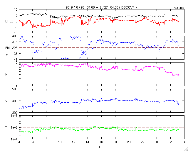 2019/ 6/27 12:30 更新 太陽は無黒点に戻りました。太陽風は平均的な速さになっています。 担当 篠原 2743黒点群は、太陽の西の端に達して、 掲載の可視光写真では見えなくなっています。 太陽は無黒点に戻っています。 X線グラフに変化はなく、 SDO衛星AIA193も全体がぼんやりと光っているだけです。 太陽風は、昨日の午後に速度が少し上がり、 400km/秒と平均的な状態に戻っています。 磁場強度も、4〜5nTと平均的な状態です。 磁場の南北成分は、 グラフの最初に南向きにやや強まった時間帯があり、 AE指数では、この頃に600nTの中規模の変化が発生しています。 その他は、磁場は0nT付近で、磁気圏も穏やかです。 前周期の太陽風速度の高まりに関係する変化でしょうか。 この後は、再び速度が下がって、低速風になりそうです。