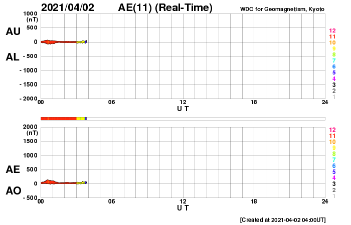 2021/ 4/ 2 13:13 更新 太陽風は低速になっています。3月の黒点相対数は 17.3 でした。 担当 篠原 WDC-SILSOより、3月の黒点相対数の月平均値は 17.3 と発表されました。 20近くに達したのは、昨年の12月以来です。 3月は、小さい黒点が多かったのですが、 途切れることなく黒点群が現れ続けたので、 この値になったのだと思います。 無黒点の日(黒点相対数が0の日)は、31日の1日だけでした。 静かな太陽が続いていますが、 1枚目の図はデータがばらつきながらも、右上に向かっています。 この後の高まり方に注目を続けて下さい。 その太陽は、今日も無黒点です。 SDO衛星AIA193では、 南東の端(左下)が少し明るくなっているので、 ここから活動的な領域が現れそうです。 しかし、規模は小さい様なので、無黒点は続くかもしれません。 太陽風は、360km/秒へ速度が下がり、 低速の風になっています。 磁場強度は、5nTから4nTへ少し下がっています。 磁場の南北成分は、グラフの後半は南寄りに変化していて、 AE指数では400nTの小規模の変化が発生しています。 太陽風が低速になっているので、 磁気圏の活動は小規模に留まるでしょう。 SDO衛星AIA193では、 太陽の中央部に淡いコロナホールが見えています。 この領域の影響は太陽風に現れるでしょうか。