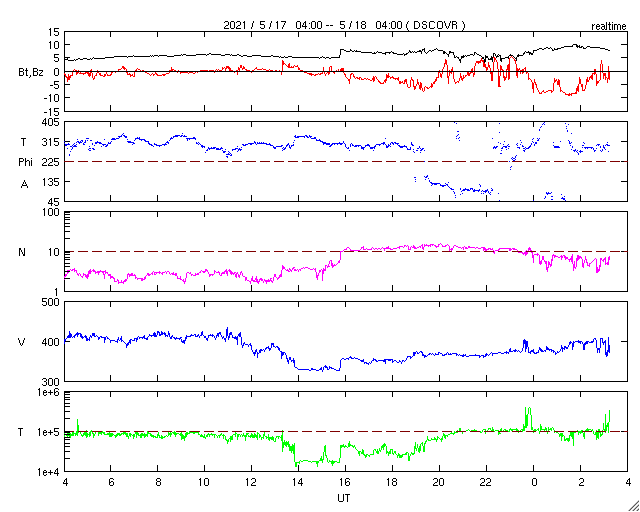 2021/ 5/17 14:39 太陽風は平均的な速度です。これから速度が高まるかもしれません。