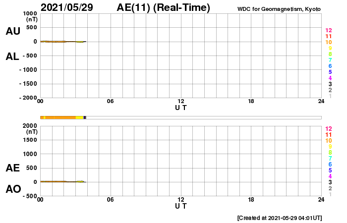2021/ 5/29 13:26 更新 C9.4の小規模フレアが発生しました。CMEも発生しています。 担当 篠原 今朝、29日7時半(世界時28日22時半)に、 太陽の北西の2824黒点群で、 C9.4の小規模フレアが発生しました。 もう少しでMクラスになるくらいの大きめのCクラスです。 SDO衛星AIA131、193による動画を掲載します。 茶色のAIA193では、 フレアの衝撃がコロナ全体に広がる様子も見えています。 2824黒点群では、昨日もC7.6の小規模フレアが発生しています。 X線グラフを見ると、ちょうど1日前です。 もう1日前にもC3.8がありますが、 これは、西の端に沈みかけている2826黒点群で起きています。 C9.4フレアに伴って、CME(コロナ質量放出)も発生しています。 SOHO衛星の画像は更新がまだなので、 太陽を左斜め50度くらいから観測している STEREO Ahead衛星のCOR2カメラの動画を掲載します。 太陽の右に向かってコロナのガスが勢い良く飛び出しています。 最初のSDO衛星の画像を見ると、フレアが発生した2824群は、 太陽の北西の端にかなり近いところにあります。 地球から見ると、 CMEは横向きに近い斜め右上に噴出していると思われるので、 太陽風の乱れは、到来しても小さい規模に留まりそうです。 SDO衛星では、太陽の中央部北寄りの2825黒点群があった領域に とても小さい黒点が見えている様です。 太陽風は、430km/秒から400km/秒へ少し下がる変化をしていますが、 平均的な速度が続いています。 磁場強度は、6nTからグラフの最後で9nTに少し強まっています。 磁場の南北成分は、北寄りの状態が続いています。 磁気圏は静穏で、AE指数はほとんど変化のない状態です。 SDO衛星AIA193では、太陽の中心部にコロナホールは見られず、 CMEによる乱れを除くと、 太陽風は穏やかな状態が続きそうです。 ![]() 2824黒点群で発生したC9.4の小規模フレア。SDO衛星AIA131、193。 (c) SDO (NASA)、(動画加工 : 宇宙天気ニュース) ![]() C9.4フレアに伴って発生したCME。STEREO Ahead衛星COR2。 (c) STEREO (NASA)、 (動画加工 : 宇宙天気ニュース) ![]() SDO衛星のAIA193カメラによる太陽コロナの様子 (c) SDO (NASA) ![]() SDO衛星による太陽の可視光写真。マウスの矢印を写真に重ねると、黒点番号付きの写真に切り替わります。 (c) SDO (NASA) ![]() GOES衛星の太陽X線強度。赤・橙 = 0.1〜0.8 nm、青・紫 = 0.05〜0.4 nm (c) データ:NOAA/SWPC、作図:宇宙天気ニュース ![]() DSCOVRが観測した太陽風の磁場(1番上の枠、黒線は全体の強度、赤線は南北成分) および、太陽風の密度(3番目の紫線)、速度(4番目の青線) (c) データ:NOAA/SWPC、作図:宇宙天気ニュース ![]() AE指数(速報値) 下段のAEグラフの値が高くなると、オーロラ活動が活発化しています。 (c) 京都大学WDC ![]() ![]() 27日の太陽周期に合わせたデータプロット 太陽が同じ面を地球に向けていた27日前の変化から、今後を予想することができます。 (c) 作図:宇宙天気ニュース