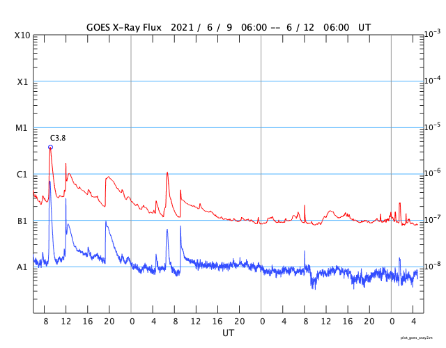 GOES衛星の太陽X線強度。赤・橙 = 0.1〜0.8 nm、青・紫 = 0.05〜0.4 nm