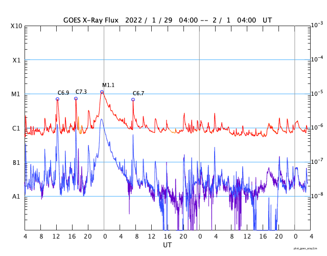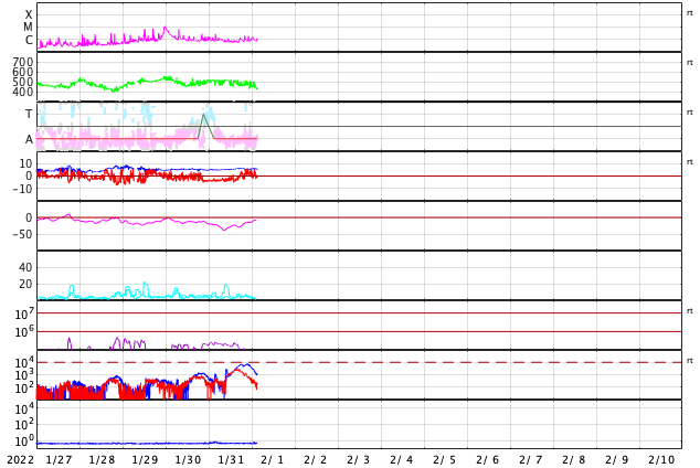 2022/ 2/ 1 12:28 更新 Cクラスの小規模フレアが続いています。CMEによる太陽風の乱れが近付いています。 担当 篠原 太陽の南西の端(右下)で、 今朝、1日8時(世界時1月31日23時)に プロミネンス噴出が発生しました。 GOES衛星SUVI 304の動画を掲載します。 なかなか見事な噴出です。 CME(コロナ質量放出)も発生している可能性がありますが (SOHO衛星やSTEREO Ahead衛星の画像がまだありません)、 地球に対して横方向の現象なので影響はないでしょう。 太陽は、北東(左上)の2940黒点群で、 C1の小規模フレアが7回程度発生しています。 中心付近の2936群や南東(左下)の2939群でも 小さい活動が続いています。 この3つの黒点群の拡大写真を2枚目に掲載しています。 この後の活動に注目して下さい。 太陽風は昨夜から速度が下がり始め、 現在は420km/秒と平均的な速度に戻っています。 磁場強度は、5〜6nTと平均的な状態が続いています。 磁場の南北成分は、南向きの変化が昨日で終わり、 以降はやや北寄りになっています。 磁気圏の活動も、 AE指数のグラフの途中までは500nTの変化が続いていますが、 以降は変化がなくなっています。 NOAA/SWPCの太陽風予報によると、 30日に発生したCMEによる太陽風の乱れは、 明日、2日10時(世界時2日1時)頃に地球に到来する可能性があります。 3枚目に予想図を掲載します。 この予報では、 速度の高まりは450km/秒程度と大きくはありません。 しかし、磁場の強まりが到来して、南向きに大きく変化すると、 オーロラの活動は一気に強まります。 これから明日にかけて注目して下さい。