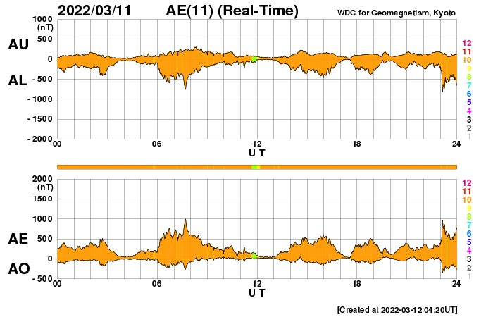 2022/ 3/12 13:25 更新 M2.2の中規模フレアが発生しました。太陽風磁場の強まりが続き、磁気圏活動も活発でした。 担当 篠原 今朝、12日7時(世界時11日22時)に、 太陽の南西(右下)の2964黒点群で、 M2.2の中規模フレアが発生しました。 Mクラスのフレアの発生は、 世界時3月2日のM2.0以来で、10日ぶりです。 SDO衛星AIA131の動画を掲載します。 STEREO Ahead衛星によると、 このフレアに伴ってCME(コロナ質量放出)も発生していて、 COR2の動画を見ると、 太陽の右下に向かってコロナのガスが飛び出しています。 発生地点が南西の端に近いので、 地球に対しては斜めの噴出となり、 影響は比較的小さいものになりそうです。 一方、昨日のCMEの到来時刻について、 NOAA/SWPCの予報が発表されました(3枚目の図)。 14日7時(世界時13日22時)頃になる可能性があるとのことで、 発生から3日と少しくらいでの到来と考えている様です。 太陽風の速度は450km/秒近くと、特に高まることはない様です。 磁場の強まりがやって来て、南向きに大きく変化すると、 オーロラなどの磁気圏の活動が強まります。 明後日は、太陽風や磁気圏の変化に注目してください。 太陽風は、速度は400km/秒前後と平均的な状態ですが、 昨夜、11日20時(世界時11日11時)に 磁場の強まりが再び到来しています。 ニュースではお知らせしていなかったのですが、 8日に太陽の北西側で小さいフレアが発生し、 CMEの噴出が起きていました。 この乱れが続いてやって来た様です。 磁場強度は、今朝まで10nT近い強まりが続き、 -5〜 -10nTの南向きの変化が繰り返しやって来ました。 磁気圏の活動は強まった状態が続き、 AE指数では500〜1000nTの中規模の変化が 繰り返し発生しています。 現在は、磁場強度は5nTと平均的な状態に下がっています。 南向きは続いていますが、 磁気圏の活動は規模が小さくなりそうです。