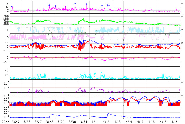 2022/ 4/26 13:31 更新 太陽の南東の端から活動的な領域が近づいています。太陽風はやや低速になっています。 担当 篠原 3月下旬から、ニュースの更新メールとフレアの速報メールについて、 gmailのアドレスへ転送できなかったという通知が 複数返ってくる様になりました(無事に転送されている場合もあります)。 gmailのアドレスへ直接送信するメールは届いている様なので、 必要な場合は、gmailのアドレスでの追加の登録をお願い致します。 (複数のメールアドレスを登録しても問題ありません) 太陽は、南東の端(左下)で活動が見える様になっています。 GOES衛星SUVI 304の動画では、 コロナのガスが飛び出す様子が見えています。 26日2時半(世界時25日17時半)の変化は、 C6.8の小規模フレアとしてX線グラフで観測されています。 活動的な領域はもうすぐこちら側に現れそうです。 注目してください。 北西(右上)の2993、2994黒点群の領域でも、 C4.6、C3.0、C4.8と小規模フレアの発生が続いています。 太陽風は、グラフの途中が乱れていますが、 全体的に速度はゆっくりと下がって、 現在は380km/秒とやや低速になっています。 磁場強度は、4nTと平均的な状態です。 AE指数は、一時的に500nTに達する変化が発生していますが、 その他は変化が小さく、 磁気圏は全体としては穏やかな状態で推移しています。 SDO衛星AIA193では、 中心部の南側にコロナホールが見えています。 3日後くらいからこの領域の影響で太陽風の速度が高まりそうです。