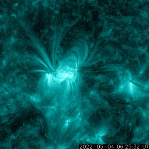 2022/ 5/ 5 10:14 更新 Mクラスの中規模フレアが続いています。太陽風は平均的な状態です。 担当 篠原 昨日のフレア以降、太陽の中心部の3004黒点群の活動が高まり、 夕方、4日18時(世界時4日9時)にM5.7、 深夜、5日1時半(世界時4日16時半)にM1.1、 今朝、5日5時(世界時4日20時)にM1.6の中規模フレアが発生し、 その他にも、C8.6、C4.1など小規模フレアが多数発生しています。 M5.7のフレアの様子をSDO衛星AIA131の動画で紹介します。 AIA131では、この後も活発なフレアの発生を見ることができています。 SOHO衛星LASCO C2によると、 目立つ程のCME(コロナ質量放出)の発生はないようですが、 太陽の中心部の活動なので、 3日後くらいに弱い太陽風の乱れが到来するかもしれません。 3004黒点群は、この2日ほどで大きく発達しています。 ファイルサイズの関係で1日半に絞っていますが、 可視光写真による黒点の変化を動画で紹介します。 また、太陽の南東の端(左下)の3006黒点群でも 昨日、4日14時半(世界時4日5時半)にC6.7の小規模フレア、 今朝、5日4時半(世界時4日19時半)にM1.5の中規模フレアなど、 回数は多くありませんが、フレアの発生が続いています。 今後もフレアの発生に注目して下さい。 太陽風は、DSCOVR衛星のデータが欠けているので、 ACE衛星のグラフも掲載します。 この2つによると太陽風の速度は360〜400km/秒程度と、 平均的か低速くらいで穏やかに推移しています。 磁場強度も4nTと平均的な状態で安定しています。 磁場の南北成分は、南向きの変化が目立っています。 AE指数は200〜500nTの小規模の変化が度々発生していて、 磁気圏はやや活動的になっています。 SDO衛星AIA193では、コロナホールは特に見られず、 太陽風は基本的には穏やかに推移しそうです。 ![]() 3004黒点群で発生したM5.7のフレアの様子。SDO衛星AIA131。 (c) SDO (NASA)、(動画加工 : 宇宙天気ニュース) ![]() 3004黒点群のこの1日半の変化。SDO衛星。 (c) SDO (NASA)、(動画加工 : 宇宙天気ニュース) ![]() SDO衛星のAIA193カメラによる太陽コロナの様子 (c) SDO (NASA) ![]() SDO衛星による太陽の可視光写真。マウスの矢印を写真に重ねると、黒点番号付きの写真に切り替わります。 (c) SDO (NASA) ![]() GOES衛星の太陽X線強度。赤・橙 = 0.1〜0.8 nm、青・紫 = 0.05〜0.4 nm (c) データ:NOAA/SWPC、作図:宇宙天気ニュース ![]() DSCOVRが観測した太陽風の磁場(黒線は全体の強度、赤線は南北成分) 磁場の向き、プラズマの密度、速度、温度 (c) データ:NOAA/SWPC、作図:宇宙天気ニュース ![]() ACEが観測した太陽風の磁場(1番上の枠、白線は全体の強度、赤線は南北成分) および、太陽風の密度(3番目の橙線)、速度(4番目の黄線) (c) NOAA/SWPC ![]() AE指数(速報値) 下段のAEグラフの値が高くなると、オーロラ活動が活発化しています。 (c) 京都大学WDC ![]() ![]() 27日の太陽周期に合わせた図 太陽が同じ面を地球に向けていた27日前の変化から、今後を予想することができます。 (c) 作図:宇宙天気ニュース