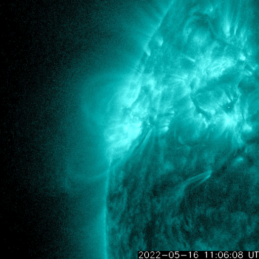 2022/ 5/17 12:31 更新 M.4の中規模フレアが発生しました。高速の太陽風が続いています。 担当 篠原 昨夜、16日22時(世界時16日13時)に、 太陽の北東の端(左上)の3017黒点群で M2.4の中規模フレアが発生しました。 SDO衛星AIA131の動画を掲載します。 太陽では、この後も隣の3014群周辺で C2〜3の小規模フレアが繰り返し発生しています。 今のところ規模は小さいですが、 この後の活動に注目してください。 太陽風は、昨日のニュースの後に速度が550km/秒へ高まりましたが、 今日に入ると下がり始めて、 現在は480km/秒とやや高速くらいになっています。 磁場の南北成分は、全体としては北寄りの傾向が続いていて、 南向きになった頃にAE指数で500nT程度の変化が発生していますが、 その他は変化の小さい状態が続いています。 SDO衛星AIA193では、 ちょうど太陽の中心部にコロナホールが見えています。 明後日以降は、この領域による太陽風速度の高まりが見られそうです。