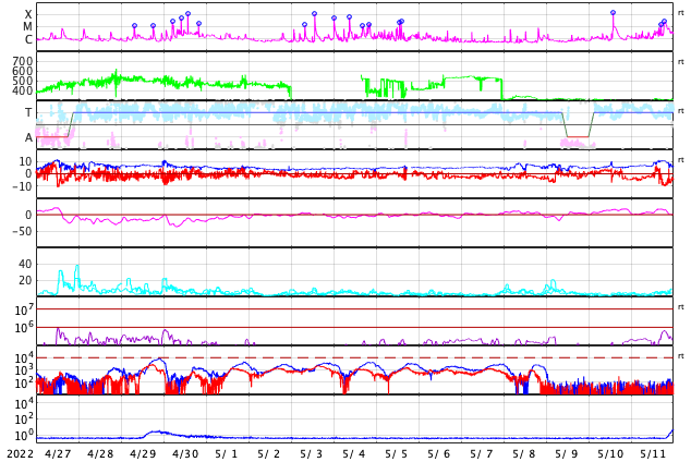 GOES衛星の太陽X線強度。赤・橙 = 0.1〜0.8 nm、青・紫 = 0.05〜0.4 nm (c) データ:NOAA/SWPC、作図:宇宙天気ニュース ![]() | ||||||||||||||||||||||||||||||||||||||||||||||||||||||||||||||||||||||||||||||||||||||||||||||||||||||||||||||||||||||||||||||||||||||||||||||||||||||||||||||||||||||||||||||||||||||||||||||||||||||||||||||||||||||||||||