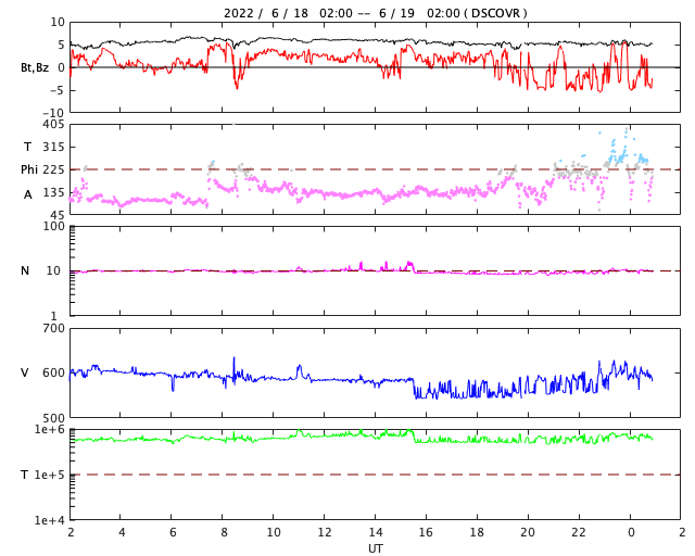 2022/ 6/19 10:05 更新 600km/秒の高速太陽風が続いています。太陽は比較的穏やかです。 担当 篠原 太陽風速度の高まりが続いています。 昨日600km/秒だった太陽風の速度は、 夜に入ると580km/秒へ少し下がったのですが、 今朝早くから再び高まって、 データが乱れてやや見にくいですが、 現在は600km/秒へ戻っている様です。 12日に始まった速度の高まりは、およそ7日にわたっています。 27日周期の図を見ると、 前周期の太陽風も、高速の状態が5月15日から9日間続いています。 この変化が同じように回帰しているということかもしれません。 前周期の速度の高まりは、5月23日までだったので、 図で対応させるともう1日程度となりますが、 現在の600km/秒という速度の高まりを考えると、 今回はこれよりも長く続きそうです。 どこまで高速風が続くか注目してください。 太陽風の磁場強度は、5nTと平均的な状態です。 南北成分は、グラフの途中までは北寄り、 後半で南寄りになっています。 AE指数もこれに添うように途中までは変化が少なく、 終わり頃に500〜1000nTの中規模の変化が発生しています。 速度の高まりが続いているので、 磁場の振れ方によってこの後も磁気圏の活動は続くでしょう。 太陽は、南西の端近く(右下)の3031黒点群で C4.8の小規模フレアが発生しています。 その他は、C1の小さいフレアが3回程度です。 全体としては落ち着いている印象です。 ![]() SDO衛星のAIA193カメラによる太陽コロナの様子 (c) SDO (NASA) ![]() SDO衛星による太陽の可視光写真。マウスの矢印を写真に重ねると、黒点番号付きの写真に切り替わります。 (c) SDO (NASA) ![]() DSCOVRが観測した太陽風の磁場(黒線は全体の強度、赤線は南北成分) 磁場の向き、プラズマの密度、速度、温度 (c) データ:NOAA/SWPC、作図:宇宙天気ニュース ![]() AE指数(速報値) 下段のAEグラフの値が高くなると、オーロラ活動が活発化しています。 (c) 京都大学WDC ![]() ![]() 27日の太陽周期に合わせた図 太陽が同じ面を地球に向けていた27日前の変化から、今後を予想することができます。 (c) 作図:宇宙天気ニュース