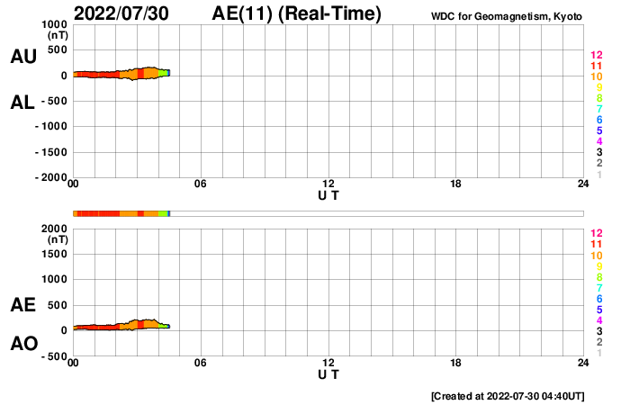 2022/ 7/30 13:51 更新 太陽風はより低速になっています。磁気圏も穏やかです。 担当 篠原 太陽風の速度は、370km/秒から350km/秒へ少し下がり、 より低速の状態になっています。 磁場強度は、5〜6nTと平均的な状態です。 磁気圏は穏やかで、 AE指数は、小さい変化がぽつんと見られる程度です。 SDO衛星AIA193では、 太陽の南半球にコロナホールが広がっています。 明後日くらいから、 この領域の影響で太陽風の速度が高まる可能性があります。 太陽は、南東(左下)の3068黒点群で、 Bクラスの小さいフレアが度々発生しています。 黒点も少し大きくなっている様で、 この後、活動の規模が大きくなるか、注目してください。