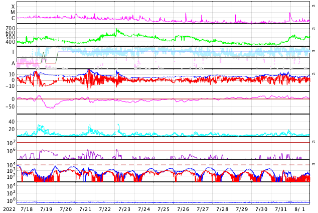 2022/ 8/19 14:49 更新 3078黒点群でMクラスの中規模フレアが4回発生しています。高速の太陽風が続いています。 担当 篠原 3078黒点群の活動が続いています。 昨夜は、18日19時(世界時18日10時)にM1.3、 18日19時半(世界時18日10時半)にM1.5、 18日23時(世界時18日14時)にM1.3と、 中規模フレアを3回起こし(1枚目の動画)、 先ほど、19日13時半(世界時19日4時半)にも、 3078群として11回目になる M1.6の中規模フレアを起こしています(5枚目の動画)。 その他にもCクラスの小規模フレアを繰り返し起こしていて、 X線グラフは頻繁に変化が発生しています。 昨夜のM1.5のフレアでは、コロナの噴出も発生しています。 2枚目のGOES衛星SUVI 304の動画で紹介します。 この動画では、直後に太陽の北西側(右上)からも 別の噴出が発生しています。 これらの噴出によるCME(コロナ質量放出)の様子を、 3枚目のSOHO衛星LASCO C2、C3の動画でご覧下さい。 これを見ると、あまり濃い噴出ではなかった様です。 地球に対しては斜め方向の噴出なので、 影響は到来しても小さいと思われます。 3078黒点群では、 今朝、19日7時半(世界時18日22時半)に C4.4の小規模フレアが発生したのですが、 この時もコロナの噴出が見られました。 4枚目のGOES衛星SUVI 304の動画で紹介します。 この噴出もCMEになっているでしょう。 6枚目にSDO衛星による3078黒点群の拡大写真を掲載します。 9日に太陽の南東の端(左下)に現れた3078群ですが、 10日経って南西の端に近付いて来ました。 黒点の見え方は昨日よりも小さくなっている様です。 フレアは続いていますが、この後はどの様に推移するのでしょうか。 引き続き注目してください。 太陽風は、550〜580km/秒の高速の風が続いています。 磁場強度は12nTから6nTへゆっくりと下がり、 平均的な値に戻っています。 磁場の南北成分は、昨夕以降南寄りに傾向が変わっています。 このため磁気圏の活動は強まっていて、 AE指数は1000nTを超える大規模な変化が発生し、 グラフの最後でも500〜800nTの中規模の変化が続いています。 SDO衛星AIA193の太陽コロナ写真では、 コロナホールは西側の南北に見えていて、 もう3〜4日程度は高速の風が続きそうです。